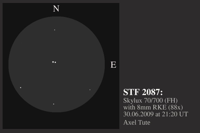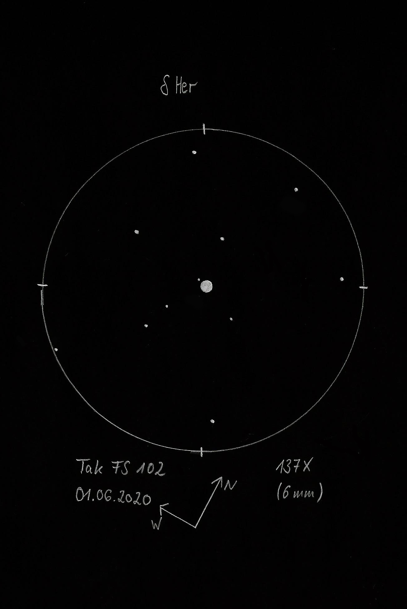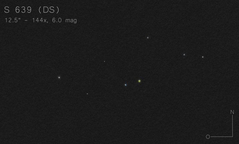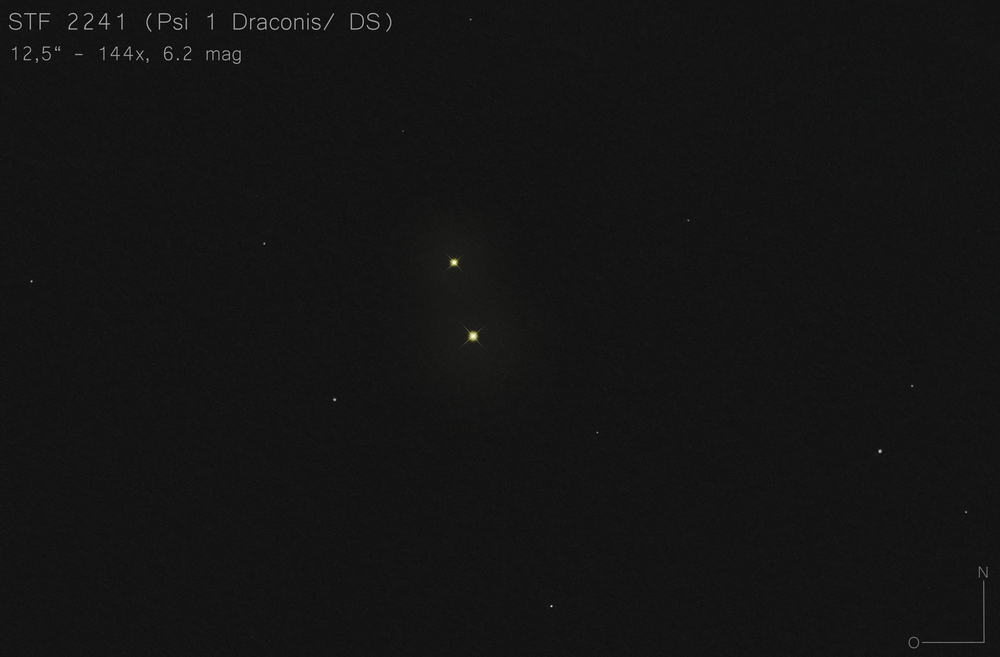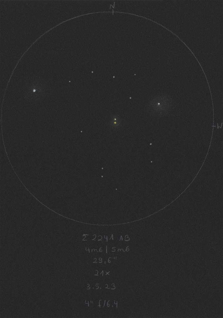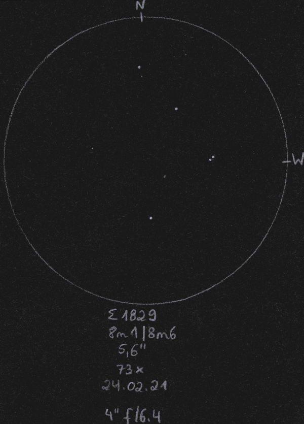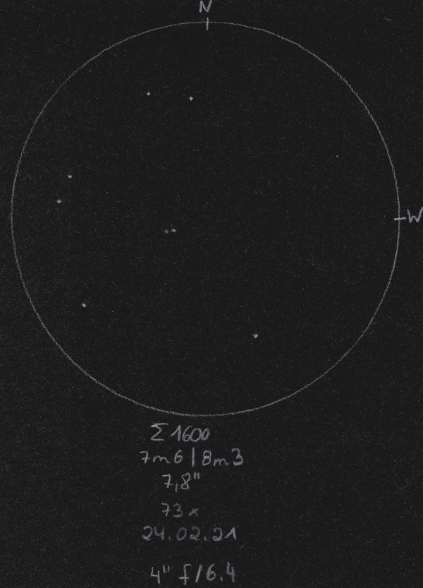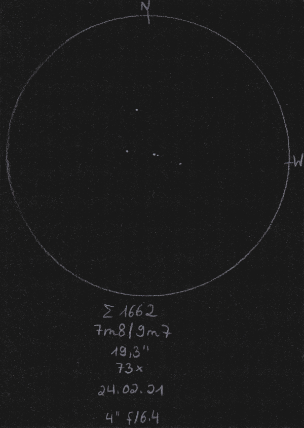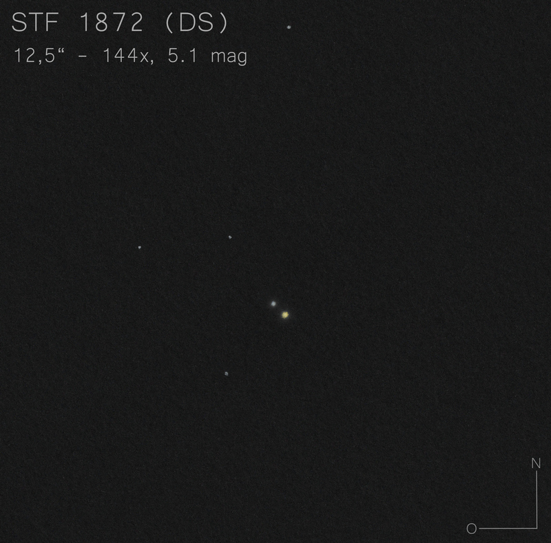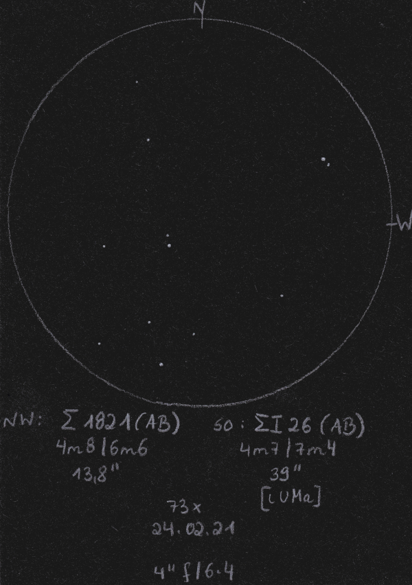 02.03.2021: Hell, sehr einfach und auffallend. Die Komponenten erscheinen nahezu gleich hell, wobei die nördliche farblich etwas wärmer wirkt. Im Süden befindet sich der schwächere Doppelstern STF 1591. |