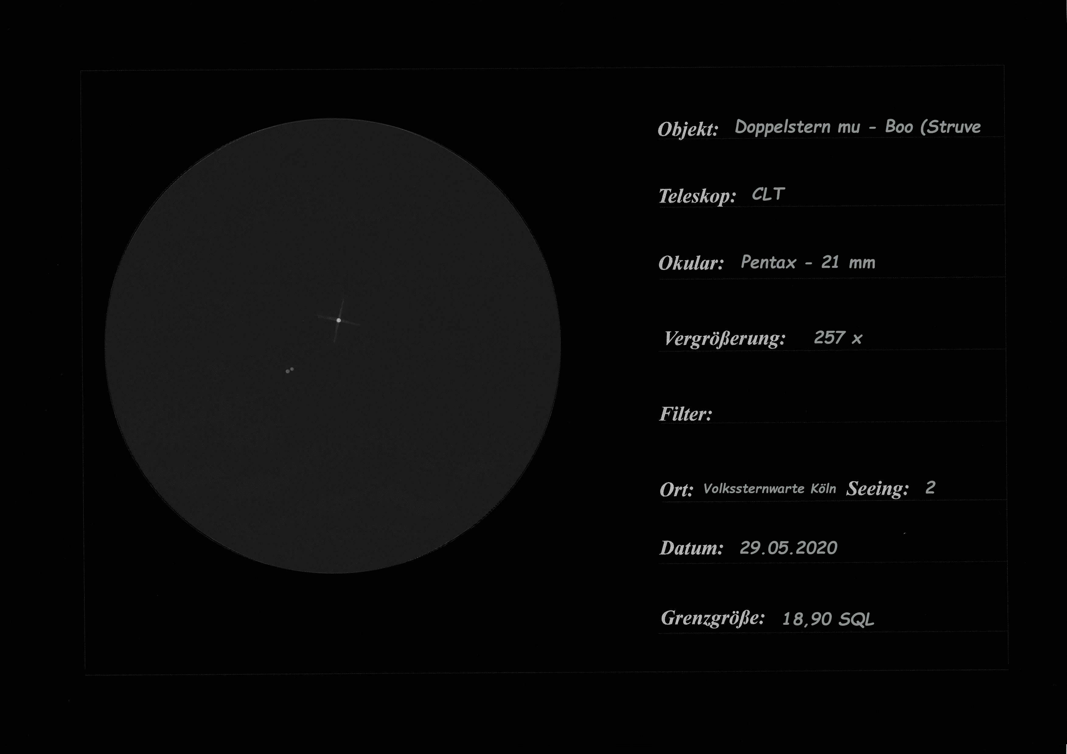 bei 32x ein kleines feines schön eng stehendes Sternpaar - Komponente A ist weiß und die Komponente B schmiegt sich grau-weiß an - Helligkeitsunterschied gut 1.5 Magnituden |