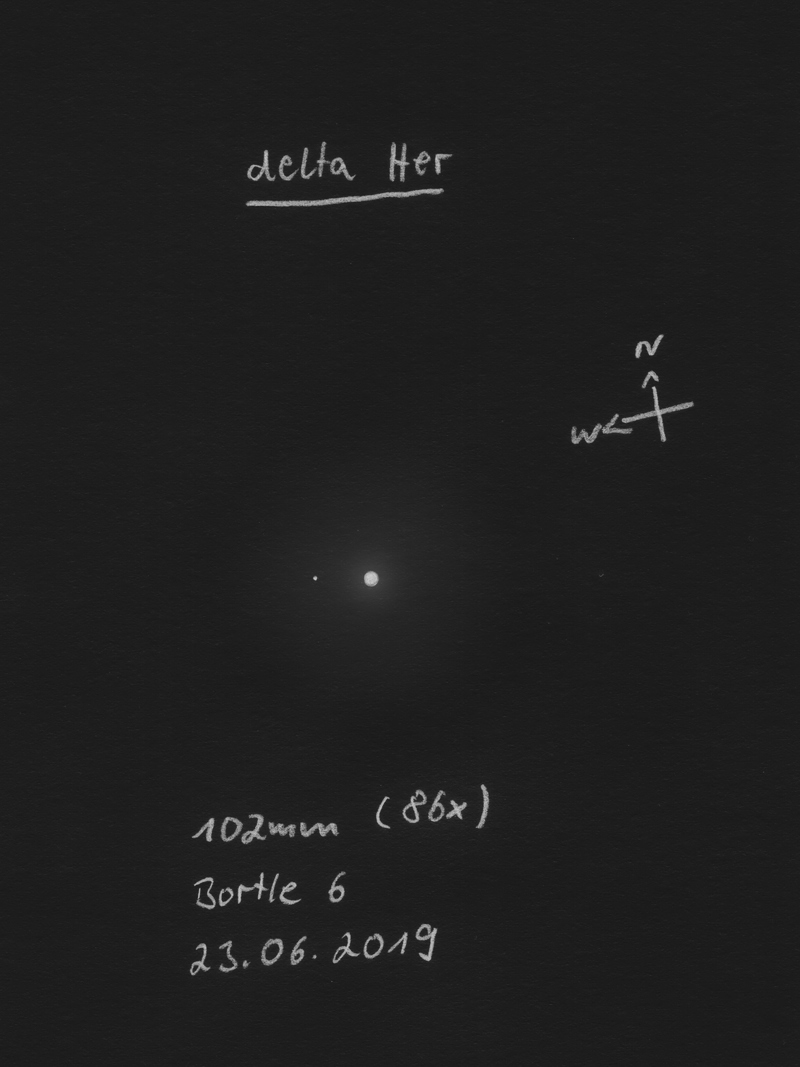 90 Her. Orange star with one part of the airy disk persistently brighter but which does not resolve to a disk. Tried up to 380x. The slightly brighter primary made this more difficult than PRY 2. This was one I wanted to try since Burnham discovered it with his 6-inch. He writes: 90 Her. "…a beautiful pair, even with small aperture. The components have a striking difference in color -- golden and blue….[due to common proper motion] there is little doubt of its being a physical system." WDS uncertain after 49 measures. Unfortunately Gaia lacks the parallax measurements for the B star |