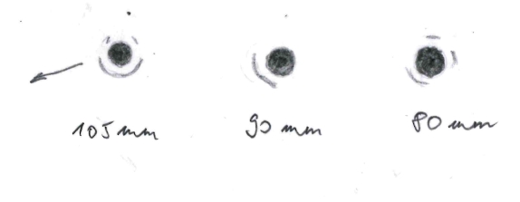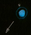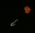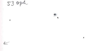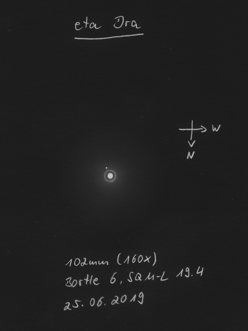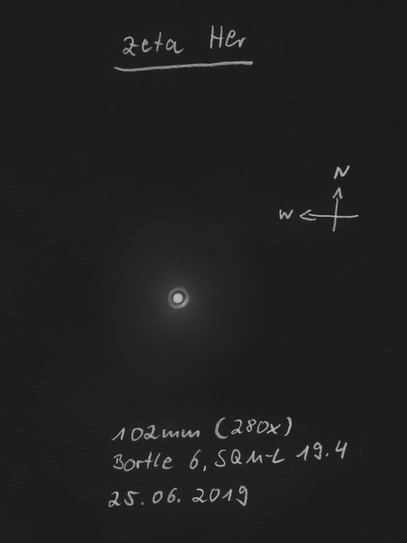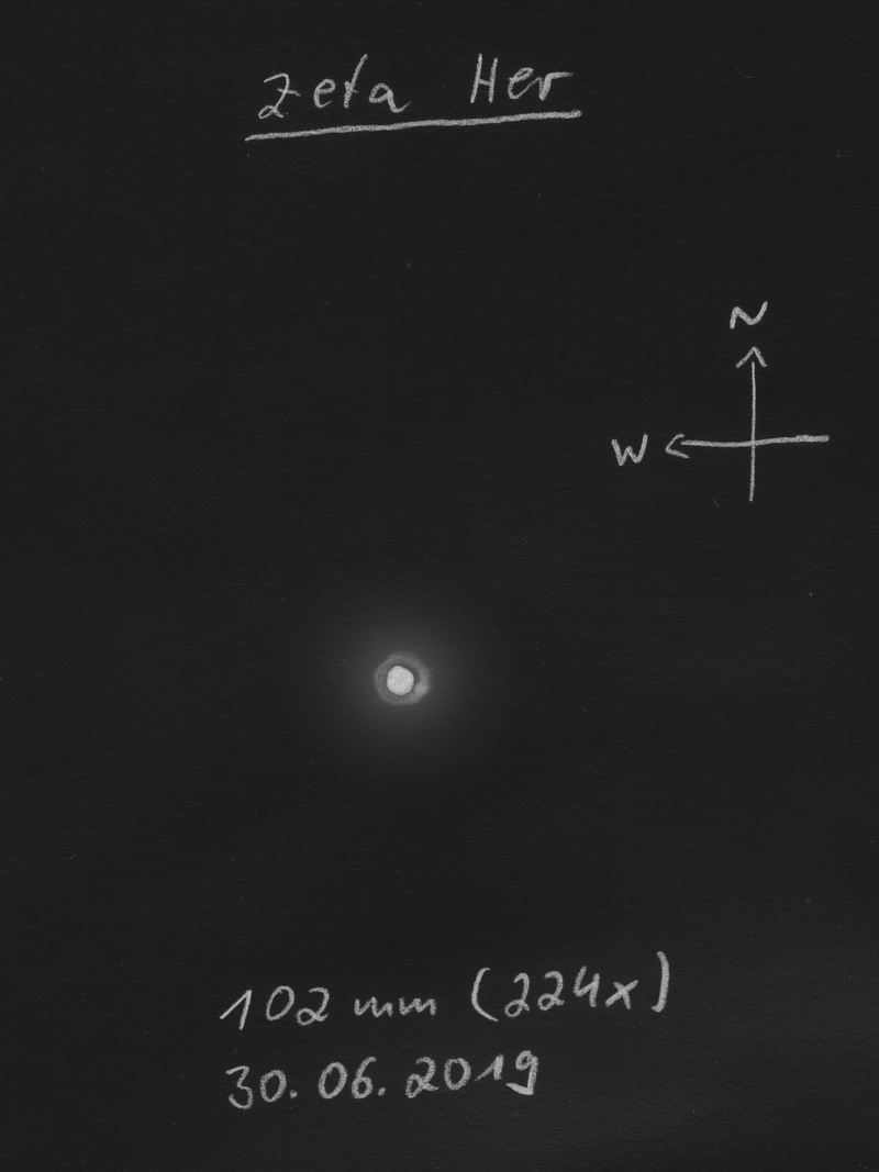 90 Her. Need stillness, it coalesces from the diffraction to a light orange point at 553x (grey at 885x). No doubt about it, star, point light. For the first 10 minutes of observing seeing allowed me to glimpse it 1 of every 10 seconds. But after a while seeing was better and I could hold it pretty consistently in both magnifications. At 553x it's in the first ring, at 885x it's in the second. |
