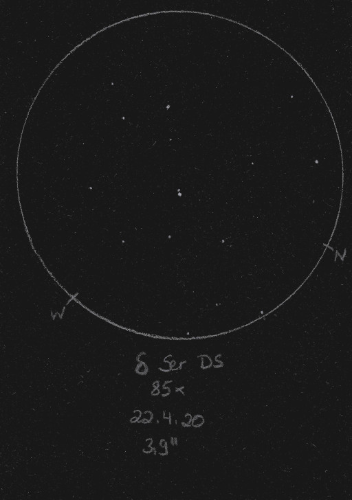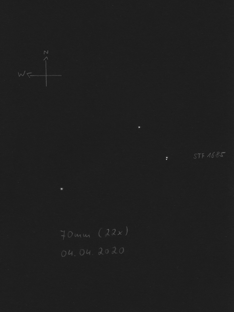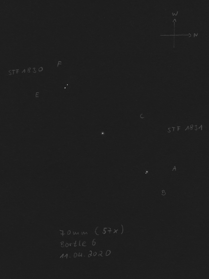 05.04.2020: Komponenten A, B und C einfach sichtbar mit abnehmender Helligkeit. Die Komponente D habe ich nicht beachtet. A: weiß-gelblich, B: blass orange. Der Anblick im 8x40 Fernglas gefiel mir besser. |