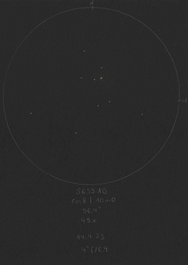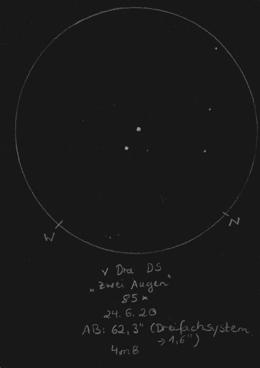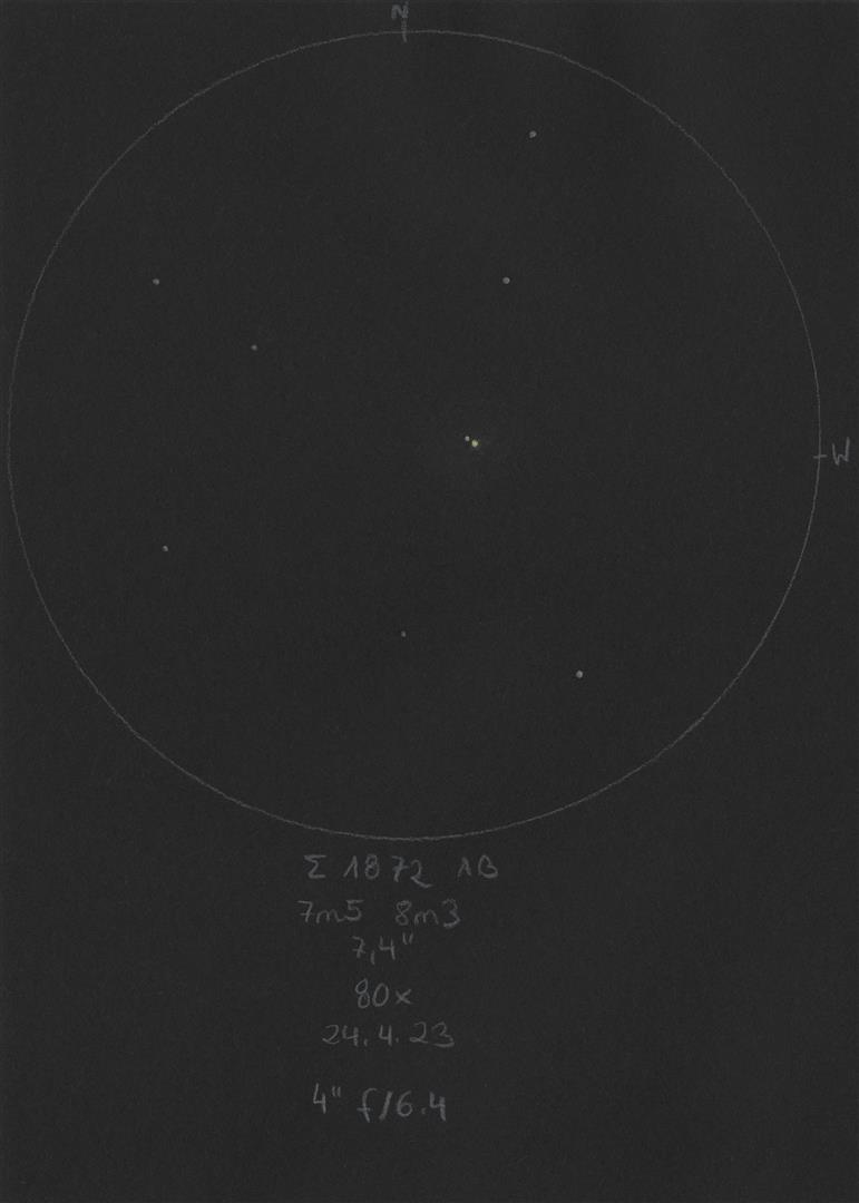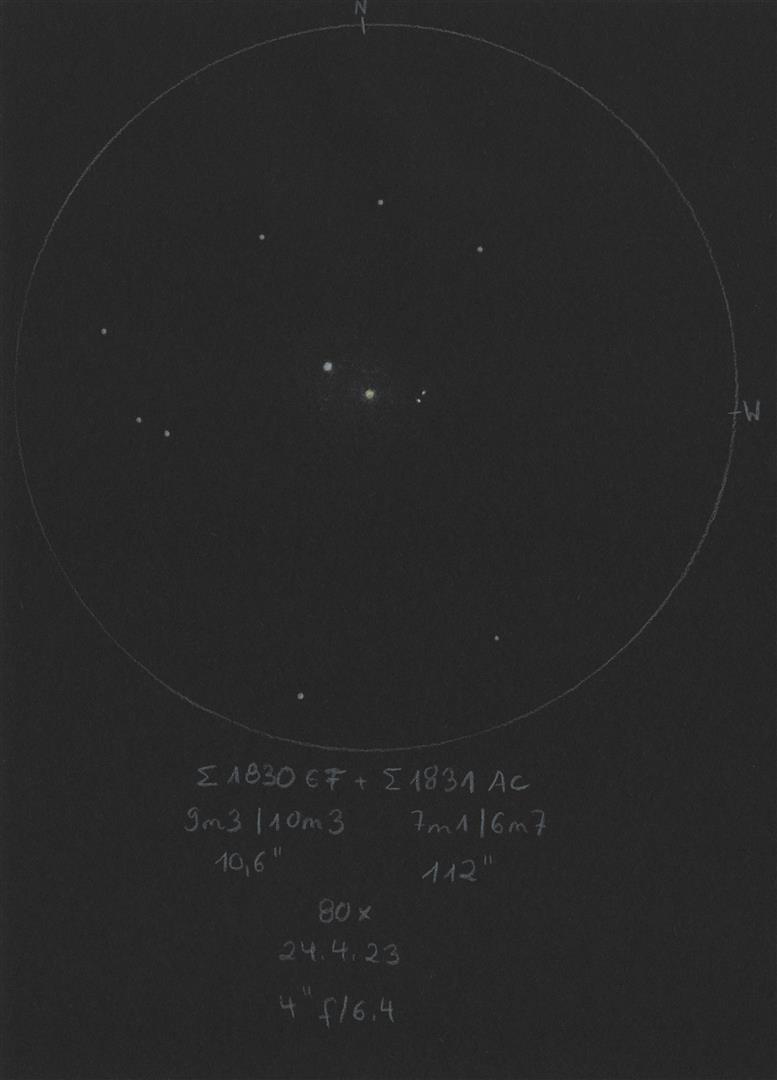 05.04.2020: Das Paar AB fällt sofort auf und zeigt sich in schönen Farben: A weiß-gelblich, B leicht orange. Fast im rechten Winkel zum Paar AB ist noch die Komponente C als schwacher Stern in etwas geringerem Abstand sichtbar. Auf die noch schwächere Komponente D habe ich nicht geachtet. |