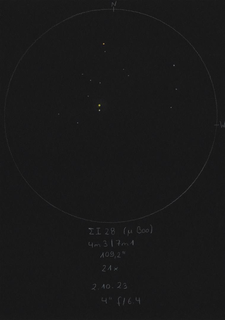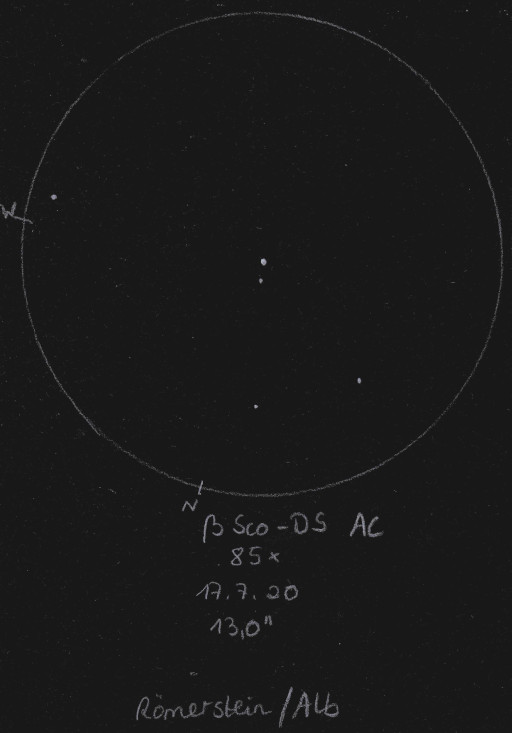 30.07.2020: Bei 22x klar getrennt mit deutlichem Helligkeitsunterschied. Die Komponenten wirkten gelblich & grau-bläulich. Bei 44x erschienen die Farben etwas intensiver: gelblich bis hell orange & dezent blau. |
