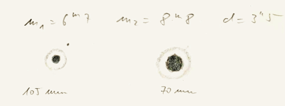 ! Extraordinarily fine pair. Bright white A and very tight B which lies just outside A's first diffraction ring, ~1.5". Need foveal coaxing to bring out B, which is very much fainter |