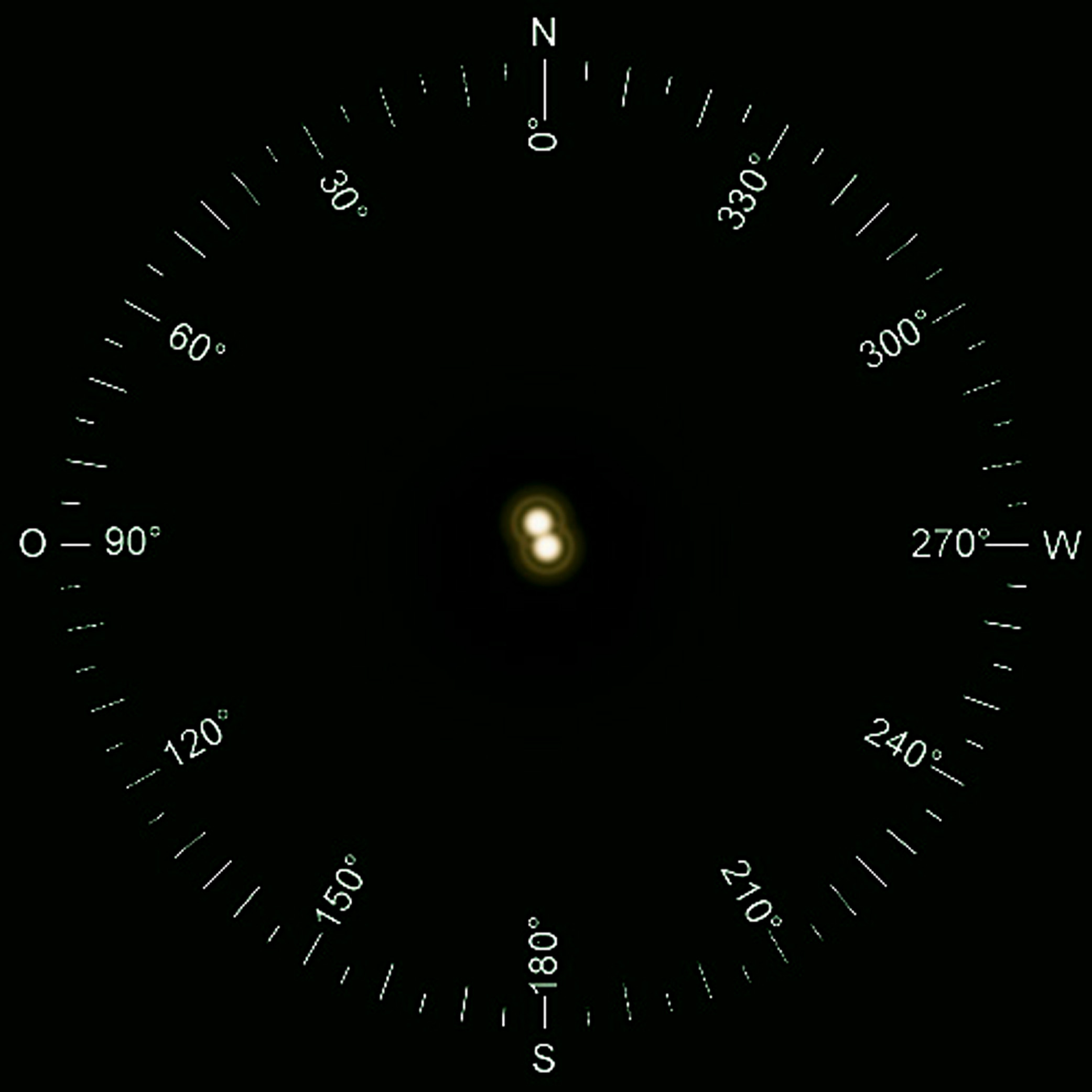 AB: 21.04.2020: Schön getrennt, auffällig bei moderatem Abstand. Die Komponenten erscheinen ähnlich hell und zeigen sich beide gelblich-orange. |