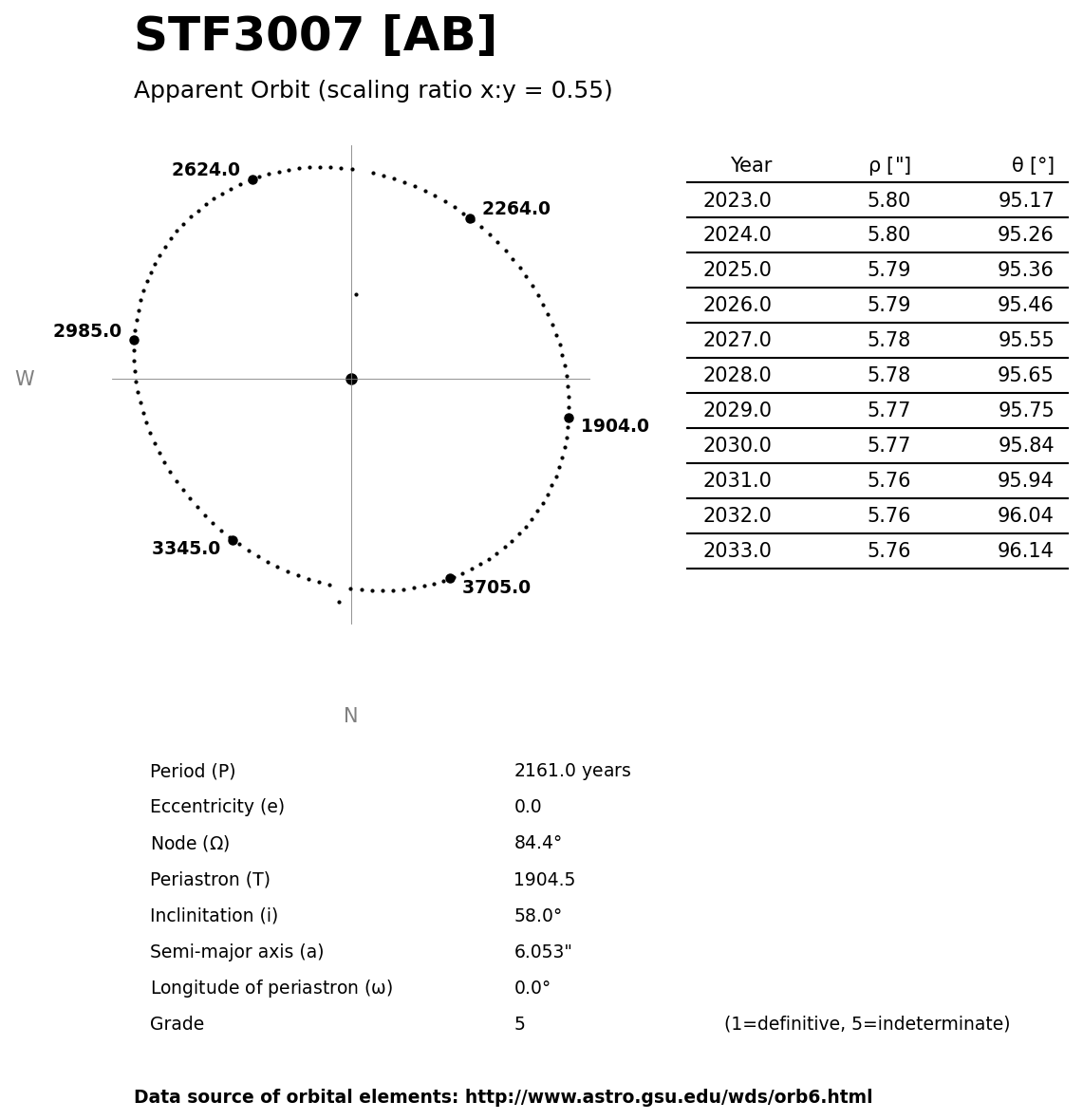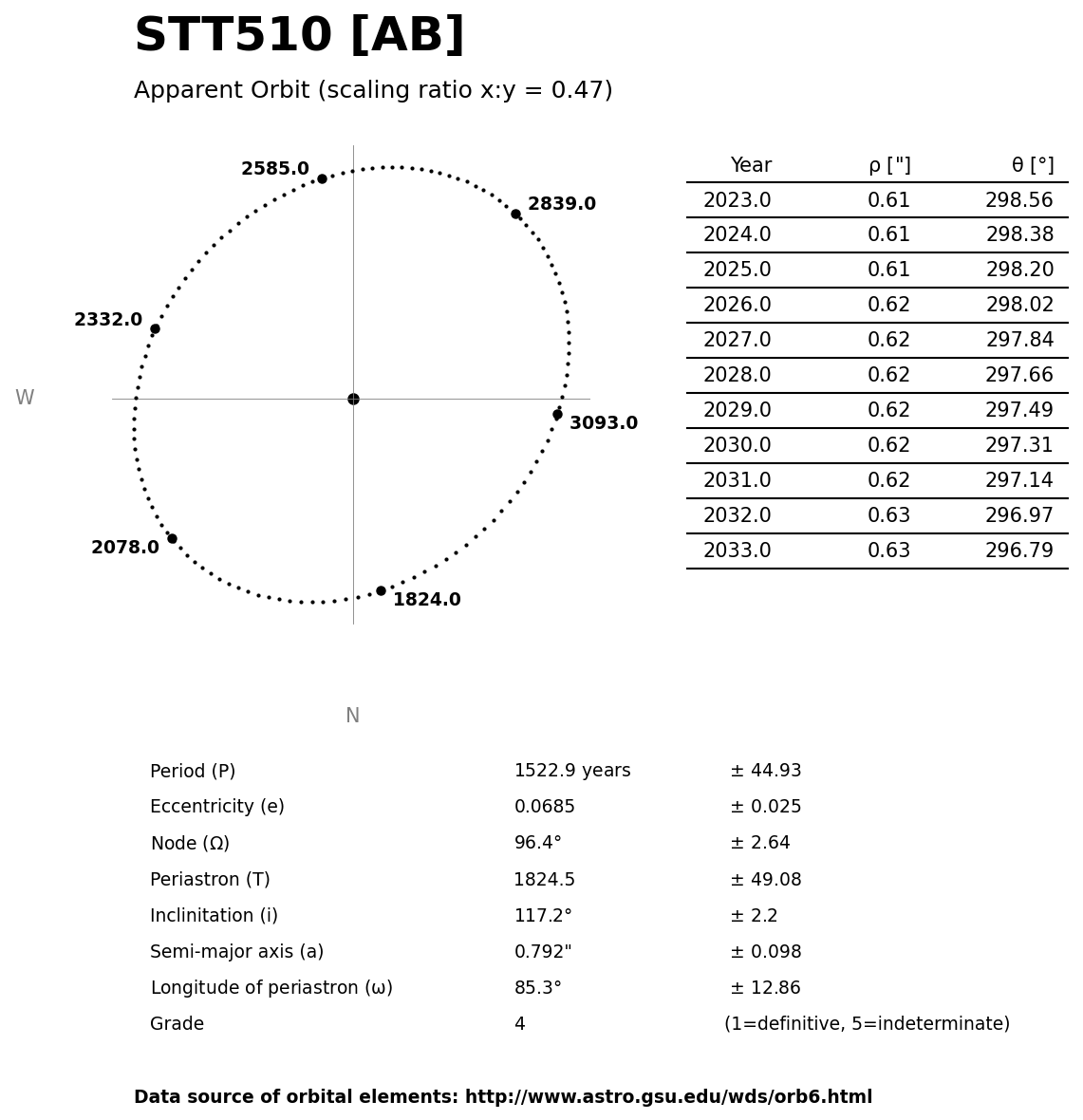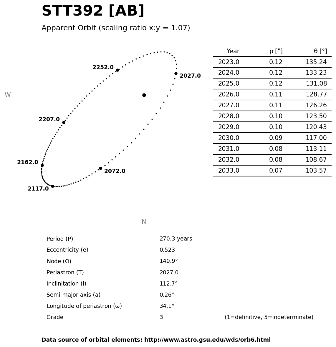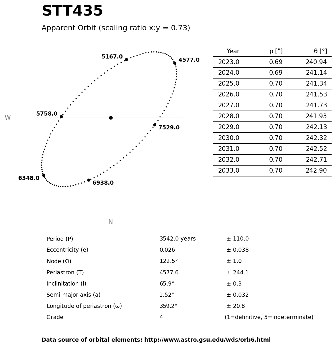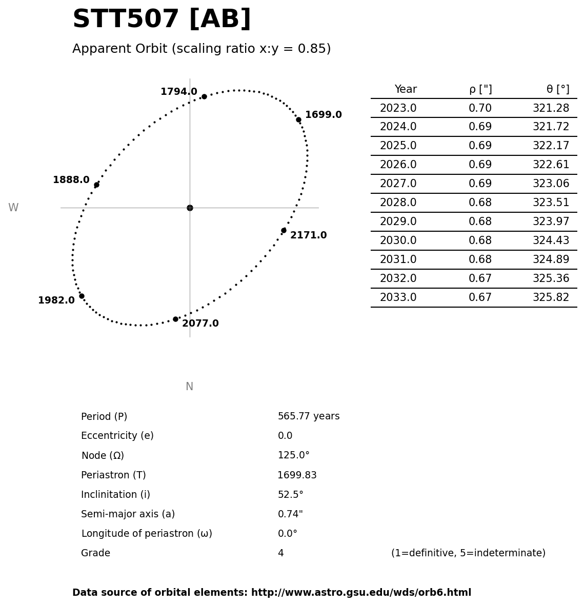 STT507 (AB): Snowman at 205x, hairline split with 333x, A is a soft white and B is light blue, ~1 delta mag. Physical with 565 year period |