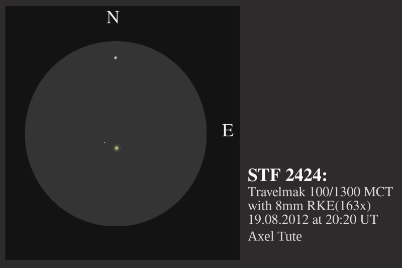 AB: Bei 57x nur knapp getrennt, wobei die B-Komponente als schwaches Sternchen erscheint. Bei 120x ist die B-Komponente deutlich und leicht elongiert auf dem ersten Beugungsring der Hauptkomponente zu sehen. Sehr schön. |