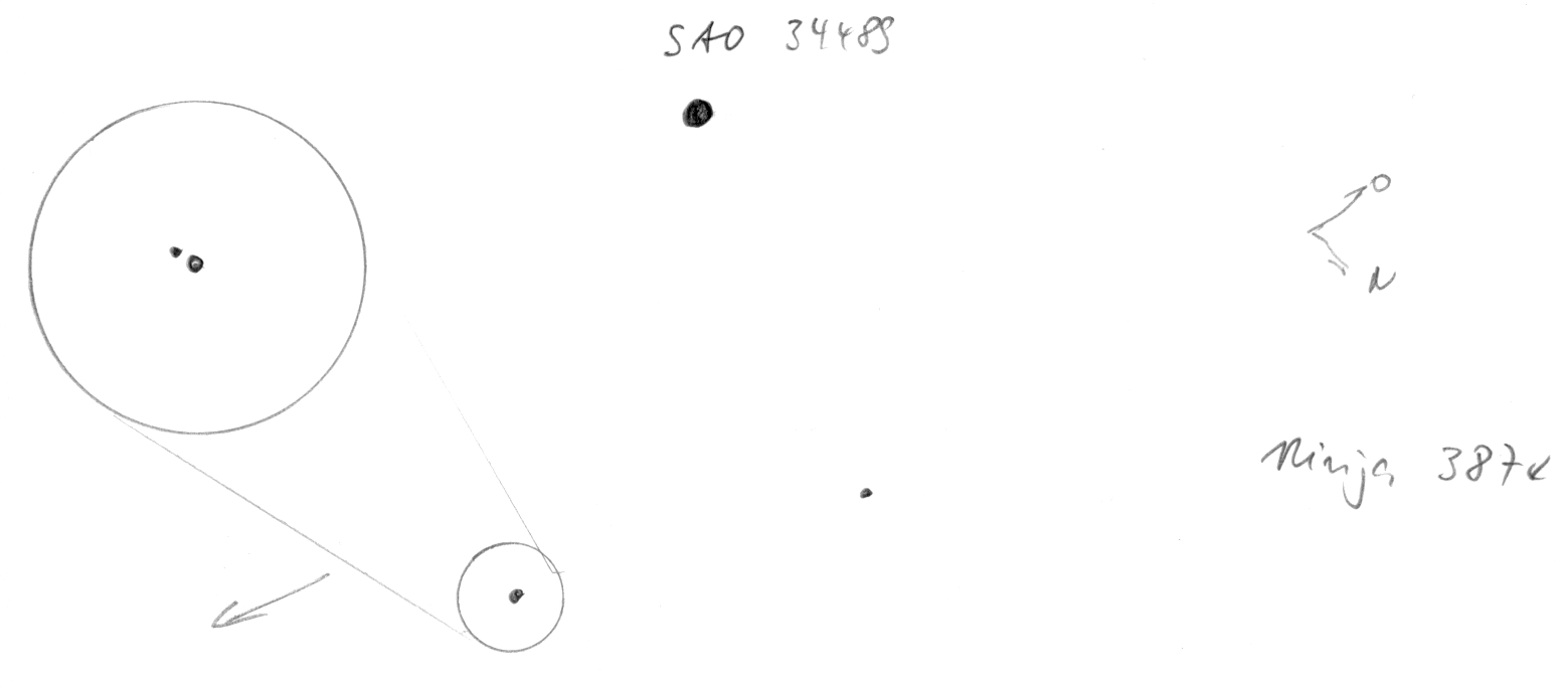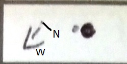 bei 136x spontan nicht zu trennen, trotz des machbaren Abstandes der Komponenten zueinander; einen Tag später: bei 200x hin und wieder getrennt, die schwächere Komponente blitzt ab und zu nordöstlich über der Hauptkomponente auf |