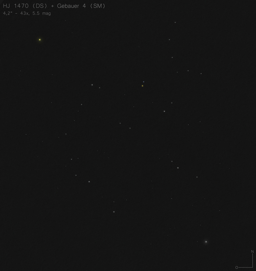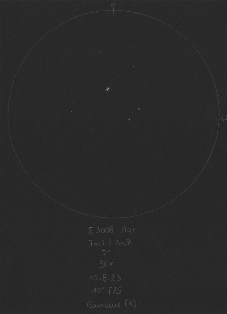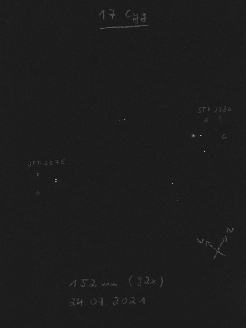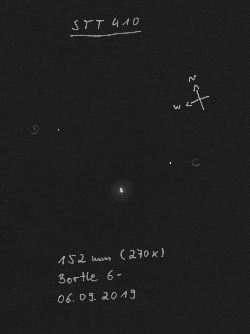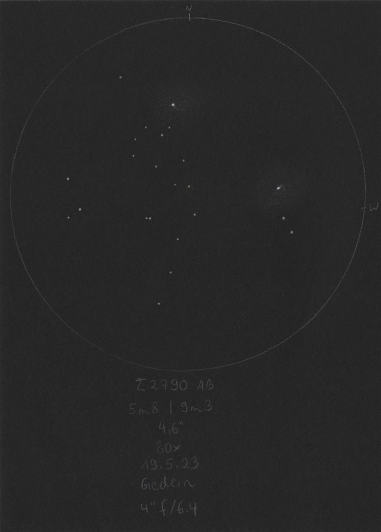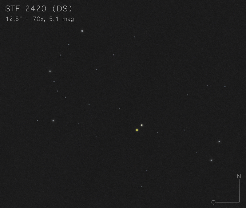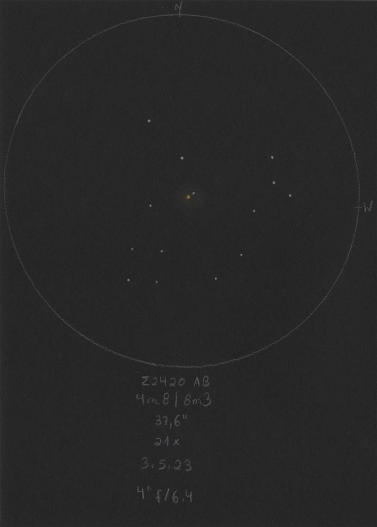 AB: Weit getrennt, das Feld absolut dominierend, mit hübschem Sterngesprenkel nach Westen. Ganz zarter Farbkontrast, der mit 3 Zoll nicht recht zu fassen war, wird mit dieser Öffnung stabil, Komponente B (40 Dra) eher bläulich, Komponente A (41 Dra) eher gelblich. |