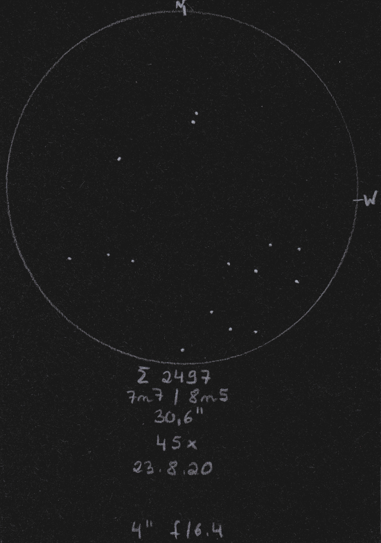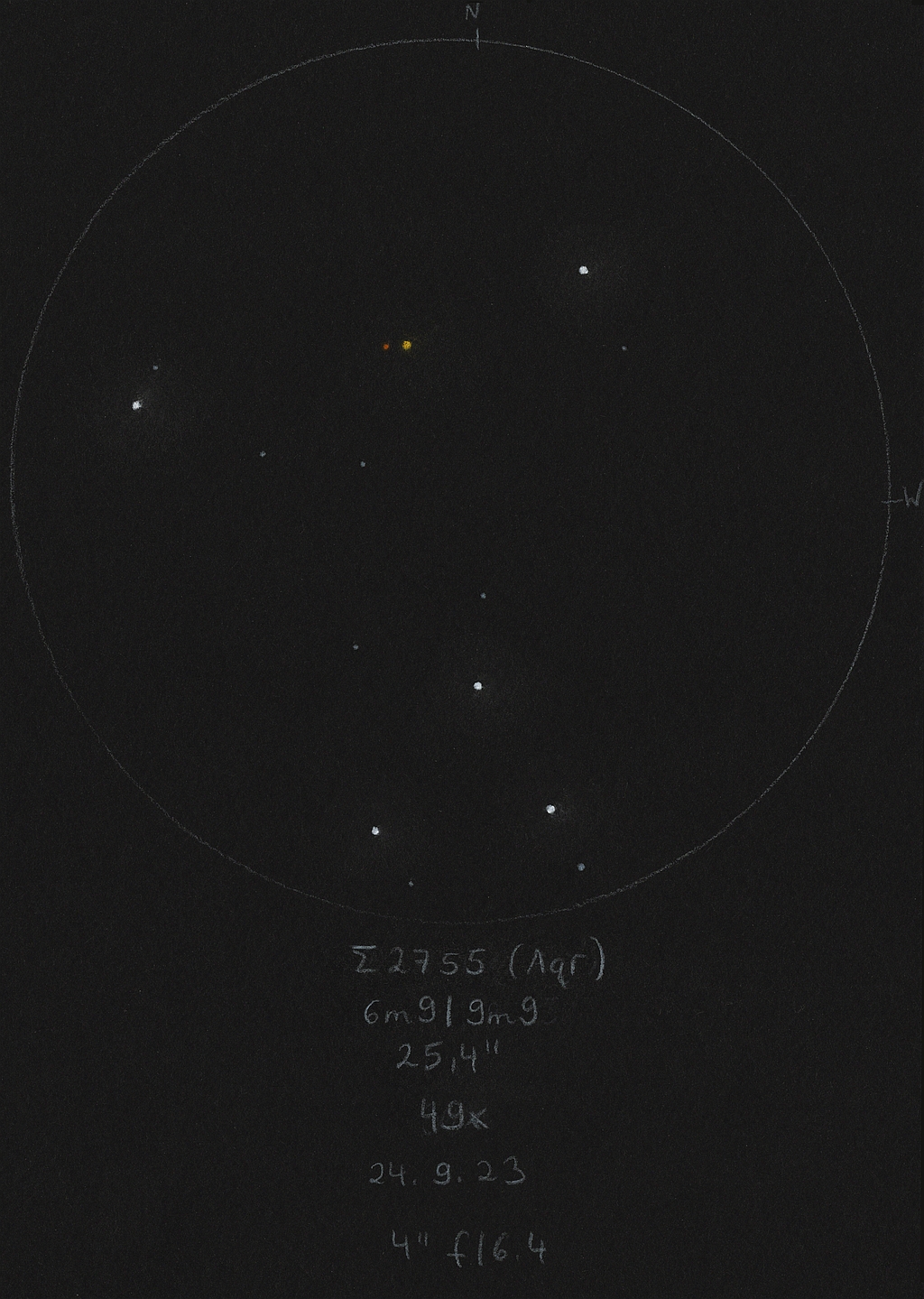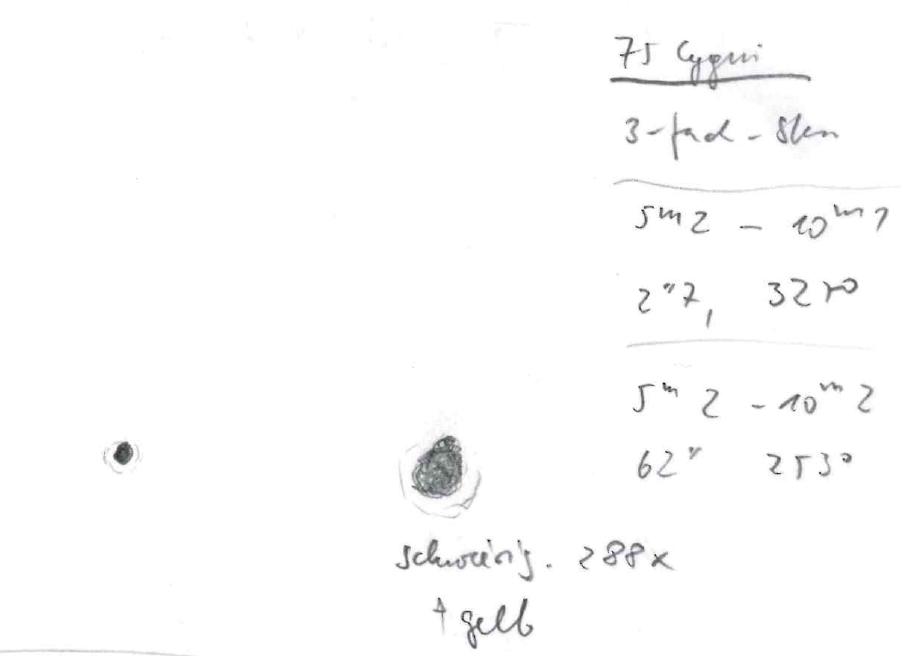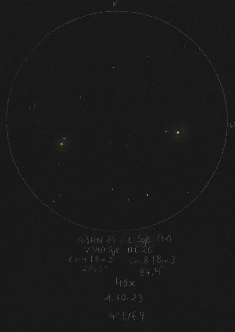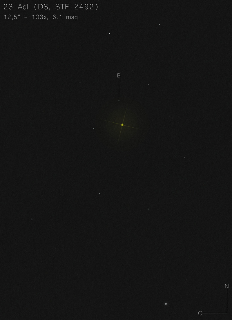 27.09.23: bei 21-fach ein eher schwacher, kupfergoldener Stern, dessen Begleiter sich erst nach etwas Blinzeln südöstlich als ganz schwache, hauchfeine Komponente auftaucht - bei 49-fach wird der Anblick schöner, im kleineren Gesichtsfeld kommt der Doppelstern viel strahlender zur Geltung, der Begleiter geht dennoch fast unter |
