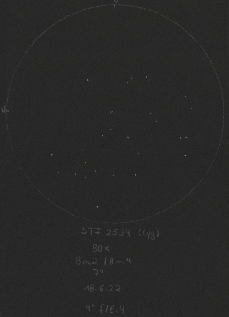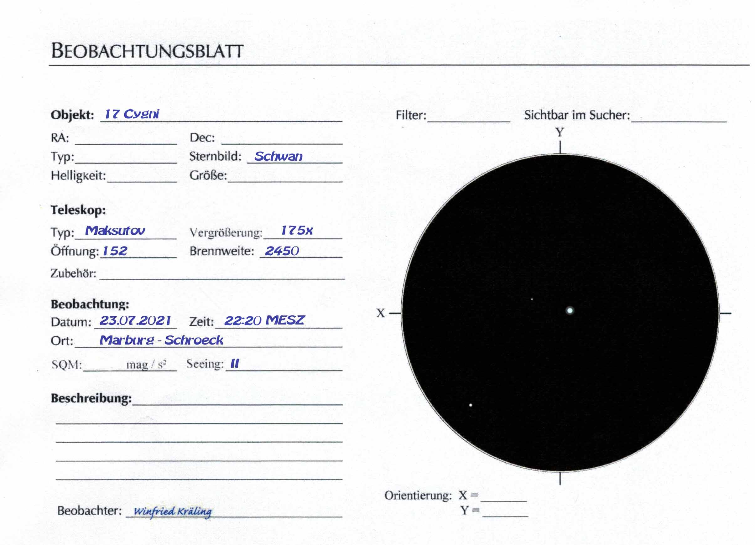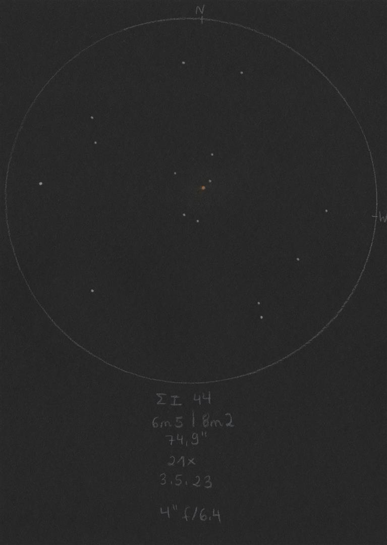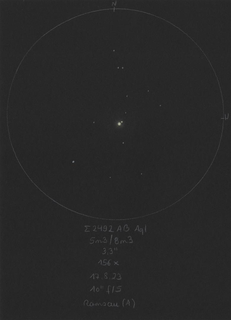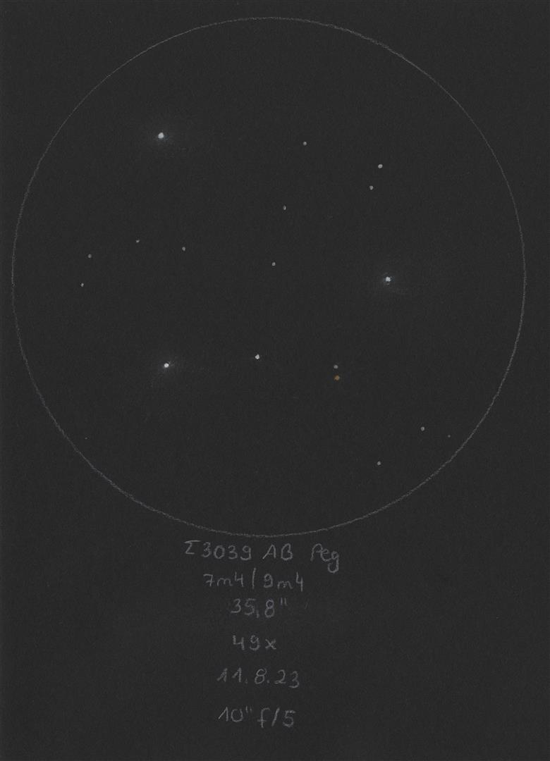27.09.23: bei 21-fach ein eher schwacher, kupfergoldener Stern, dessen Begleiter sich erst nach etwas Blinzeln südöstlich als ganz schwache, hauchfeine Komponente auftaucht - bei 49-fach wird der Anblick schöner, im kleineren Gesichtsfeld kommt der Doppelstern viel strahlender zur Geltung, der Begleiter geht dennoch fast unter |