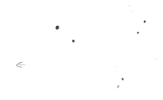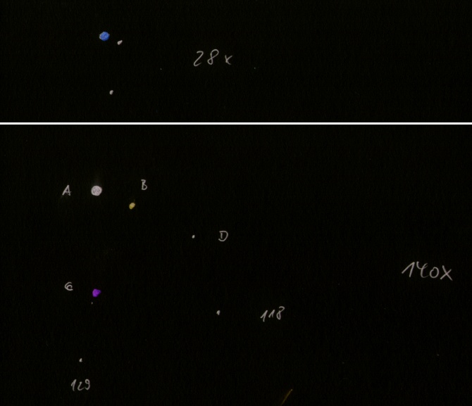 A-BC: bei 20x riecht das nicht nach Trennung, sondern es sieht nach weit auseinander stehenden Sternen aus - Komponente BC ist kupferbraun und genauso hell wie die weiß strahlende Komponente A - auf die Trennung von BC habe ich leider nicht geachtet (Sep. 3,3" laut Stelle Doppie) |
