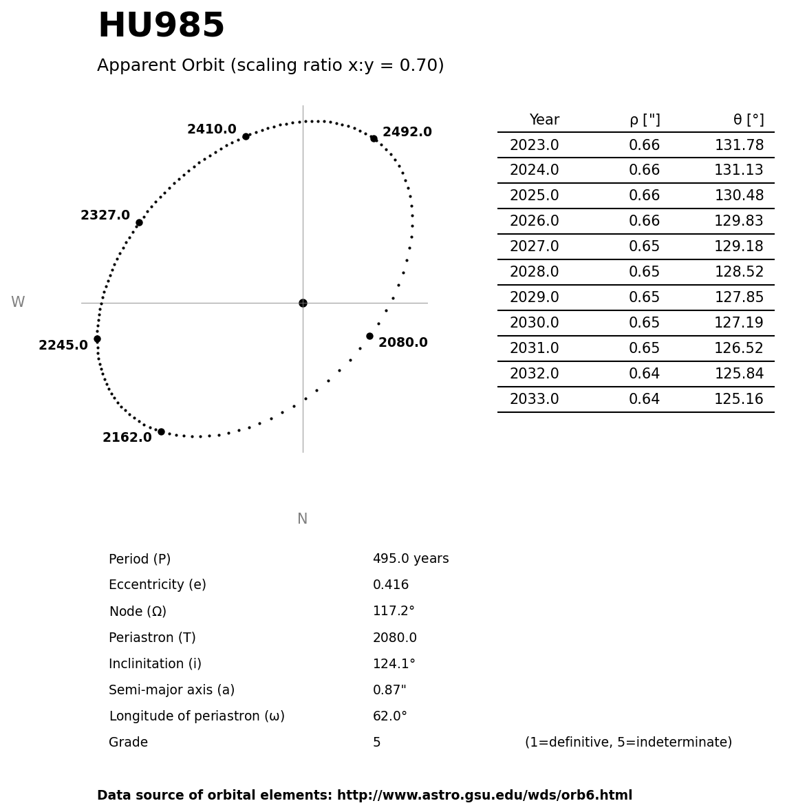 Light orange, probably elongated, but seeing is too poor to resolve. Physical with a 492 year period. Spectral class K4IIIb (yellow-orange) |