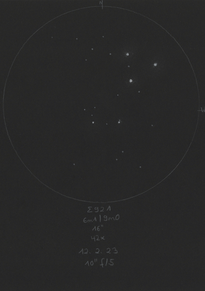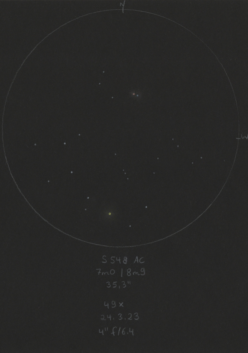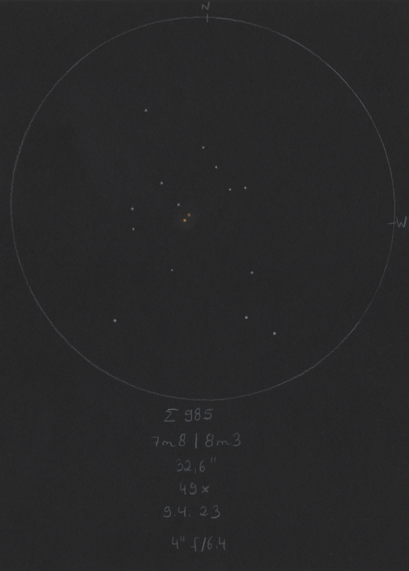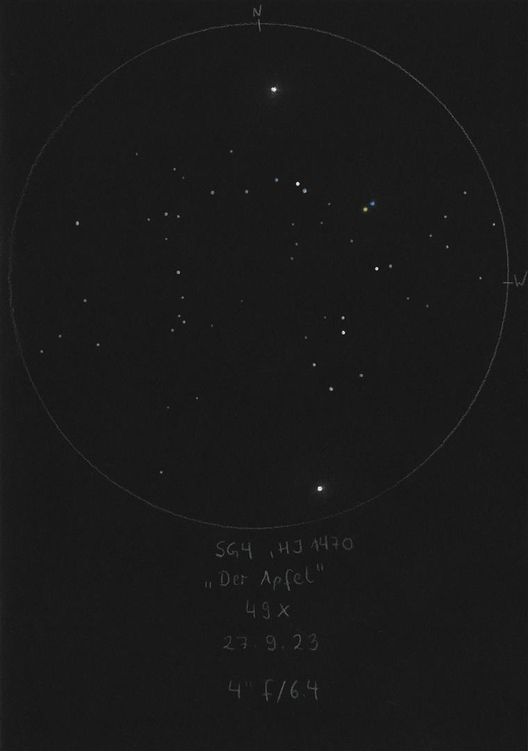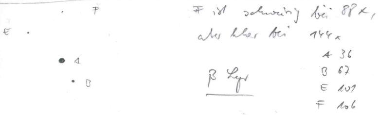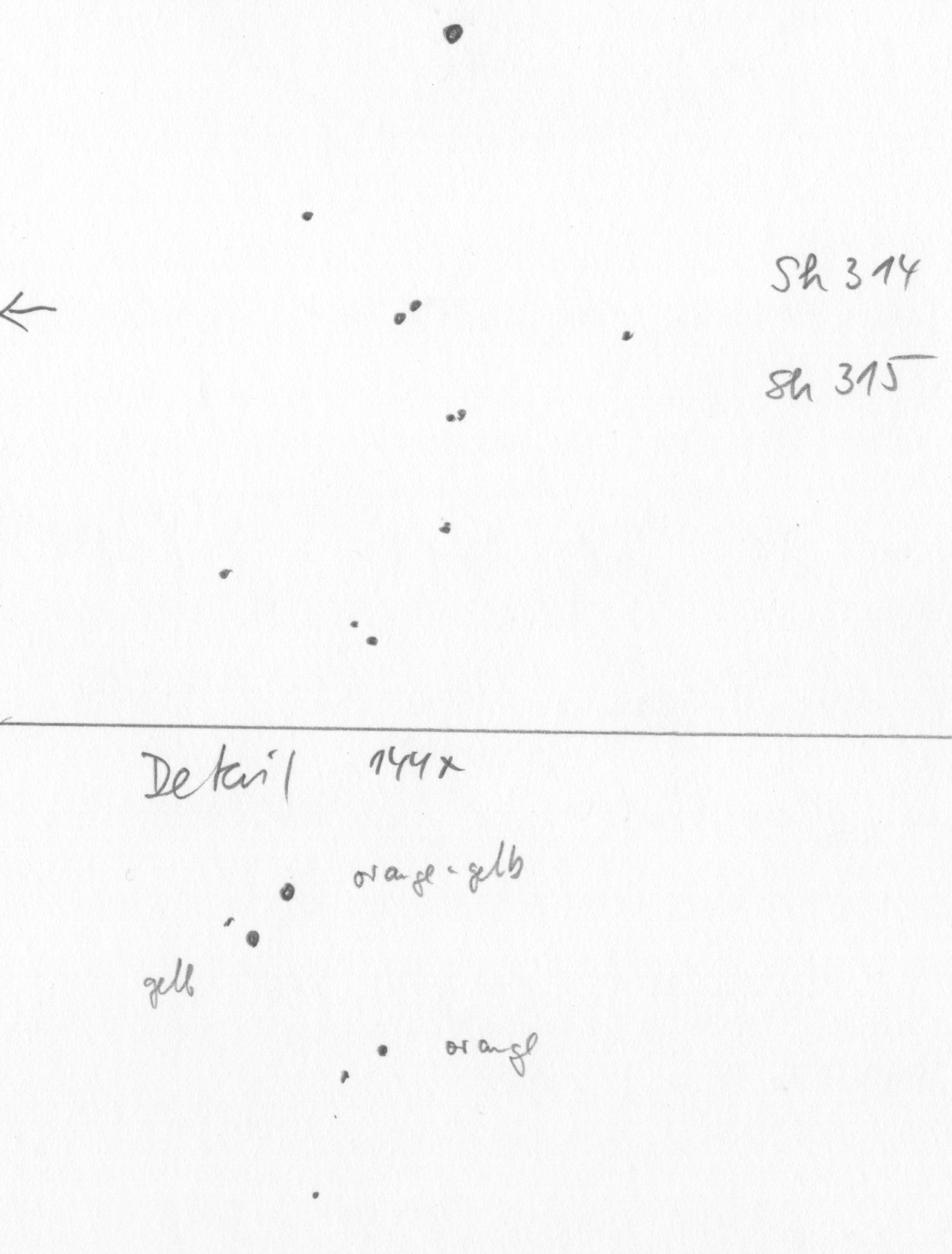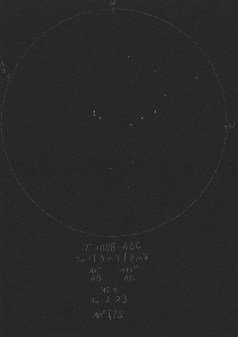A-BC: Laut Stelledoppie bilden A und BC ein physikalisches Paar, und B und C sind wieder ein enges physikalisches Paar, also ein echtes Dreifachsystem in 150 Lichtjahren Entfernung. Für die Trennung von A-BC reicht eigentlich eine kleinere Öffnung, aber mit 8 Zoll kommt der Farbkontrast von A zu BC heraus und das Paar dominiert das Sehfeld von 0,3°. Sehenswert, denn A ist zitronengelb, BC ziegelrot. |