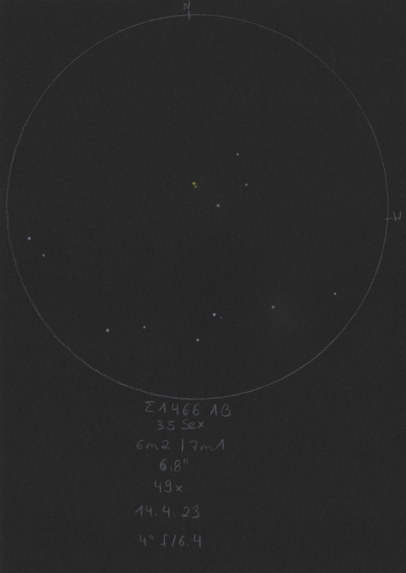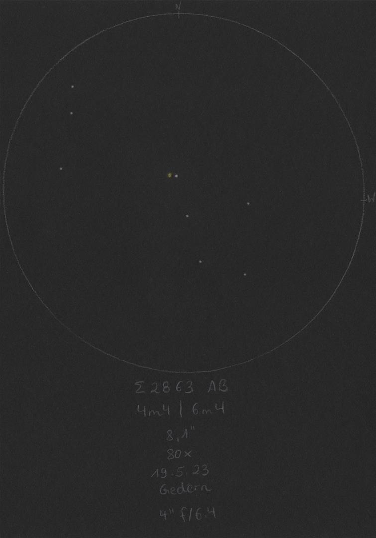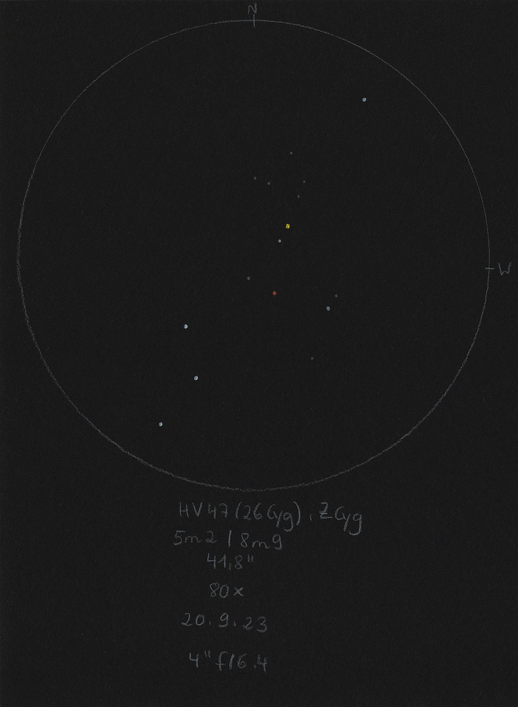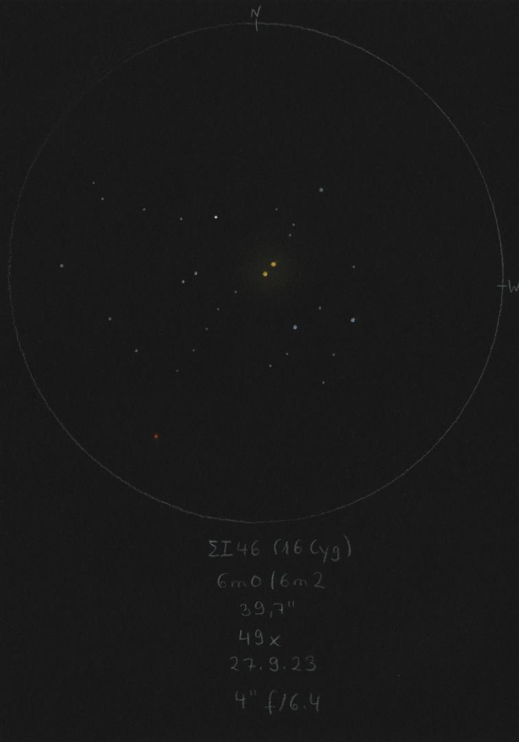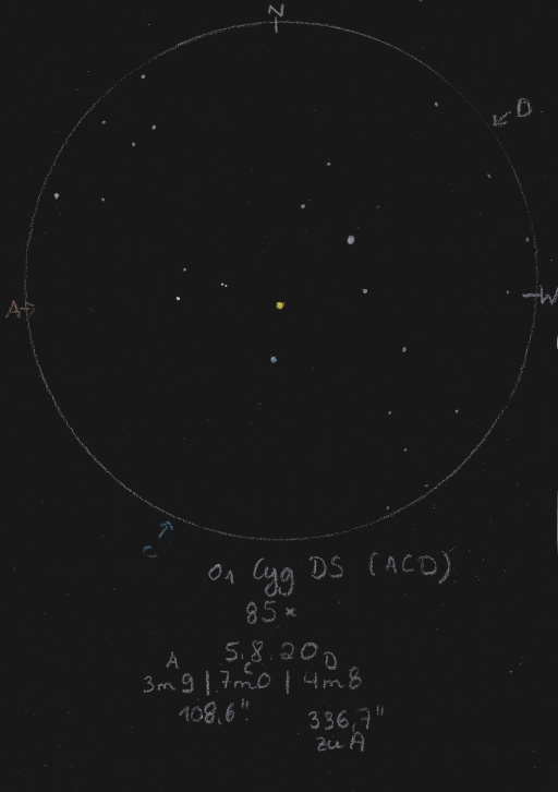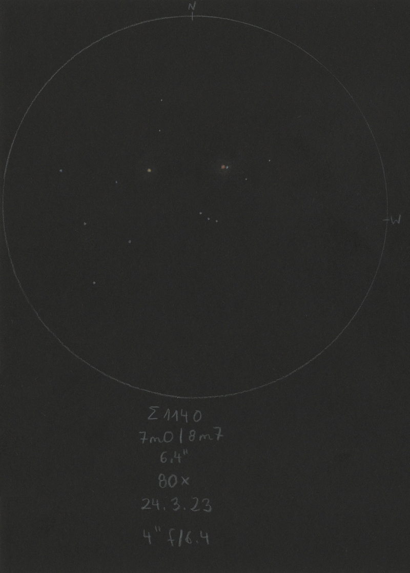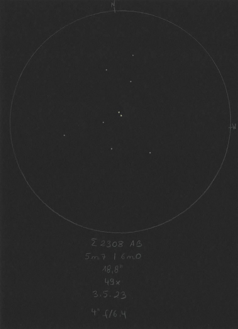A-BC: Laut Stelledoppie bilden A und BC ein physikalisches Paar, und B und C sind wieder ein enges physikalisches Paar, also ein echtes Dreifachsystem in 150 Lichtjahren Entfernung. Für die Trennung von A-BC reicht eigentlich eine kleinere Öffnung, aber mit 8 Zoll kommt der Farbkontrast von A zu BC heraus und das Paar dominiert das Sehfeld von 0,3°. Sehenswert, denn A ist zitronengelb, BC ziegelrot. |