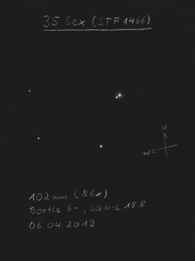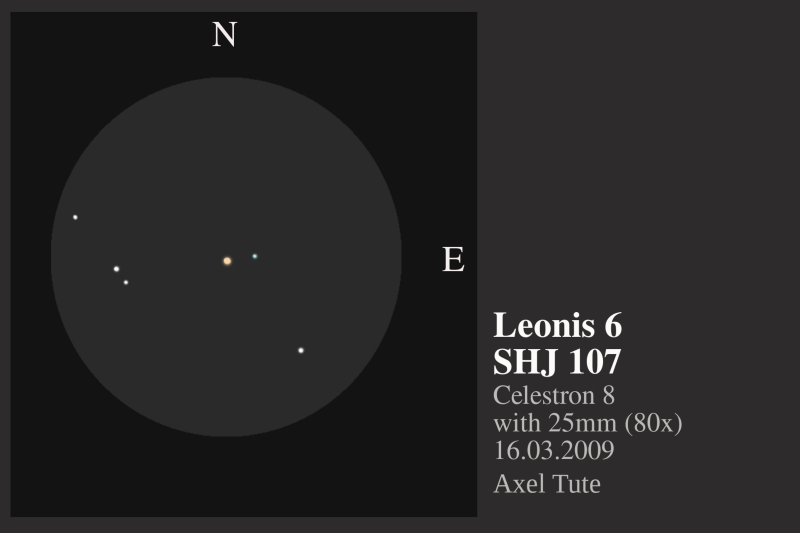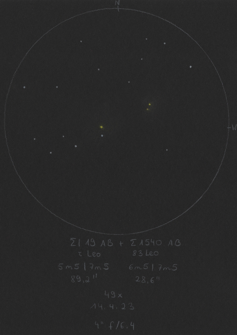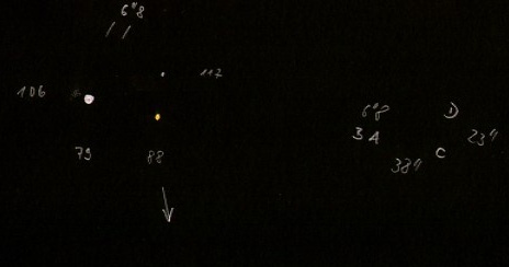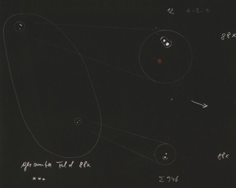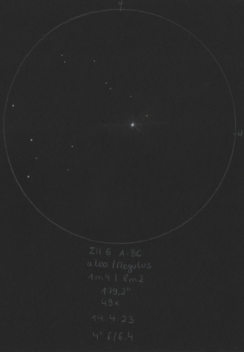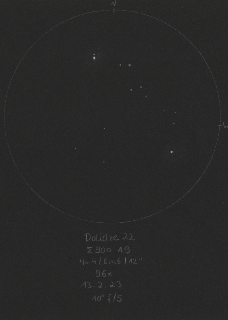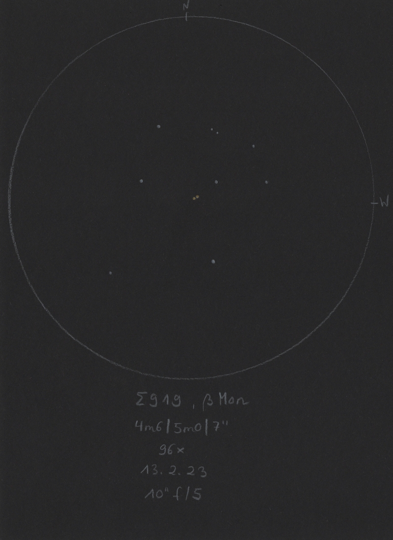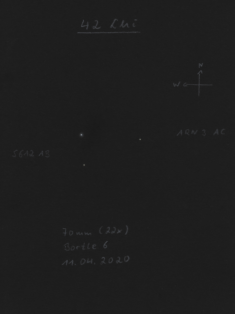 A-BC: Laut Stelledoppie bilden A und BC ein physikalisches Paar, und B und C sind wieder ein enges physikalisches Paar, also ein echtes Dreifachsystem in 150 Lichtjahren Entfernung. Für die Trennung von A-BC reicht eigentlich eine kleinere Öffnung, aber mit 8 Zoll kommt der Farbkontrast von A zu BC heraus und das Paar dominiert das Sehfeld von 0,3°. Sehenswert, denn A ist zitronengelb, BC ziegelrot. |