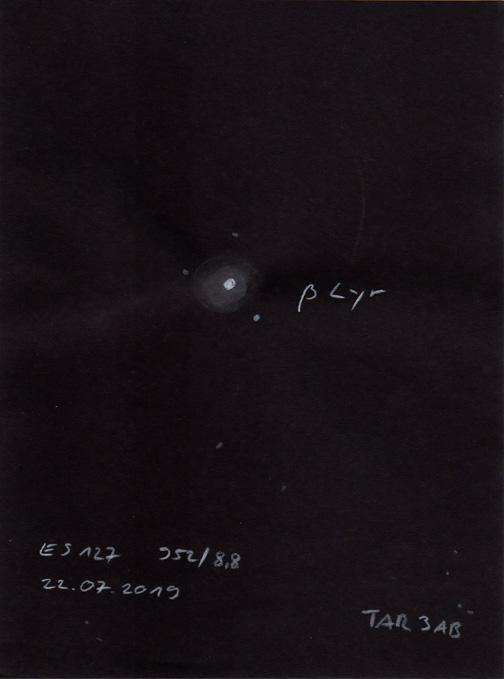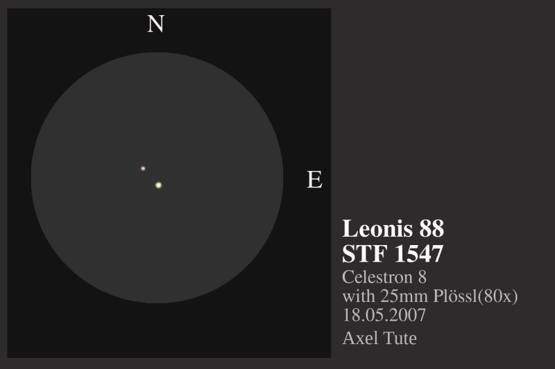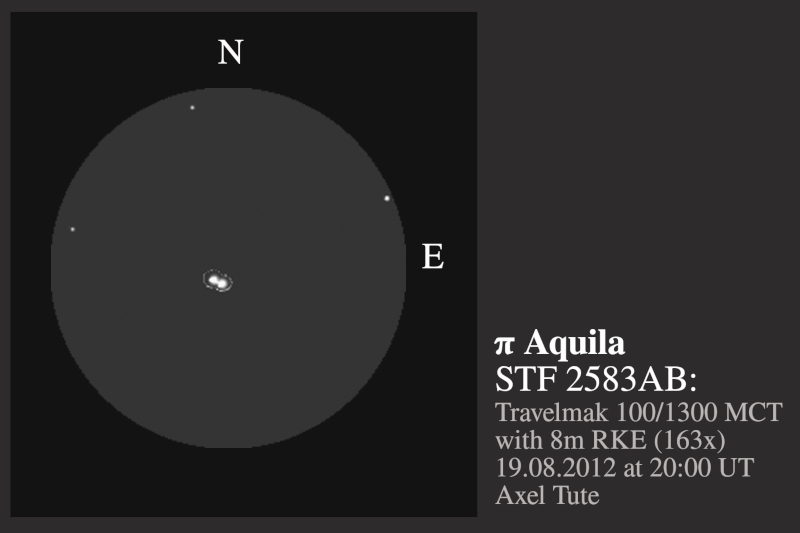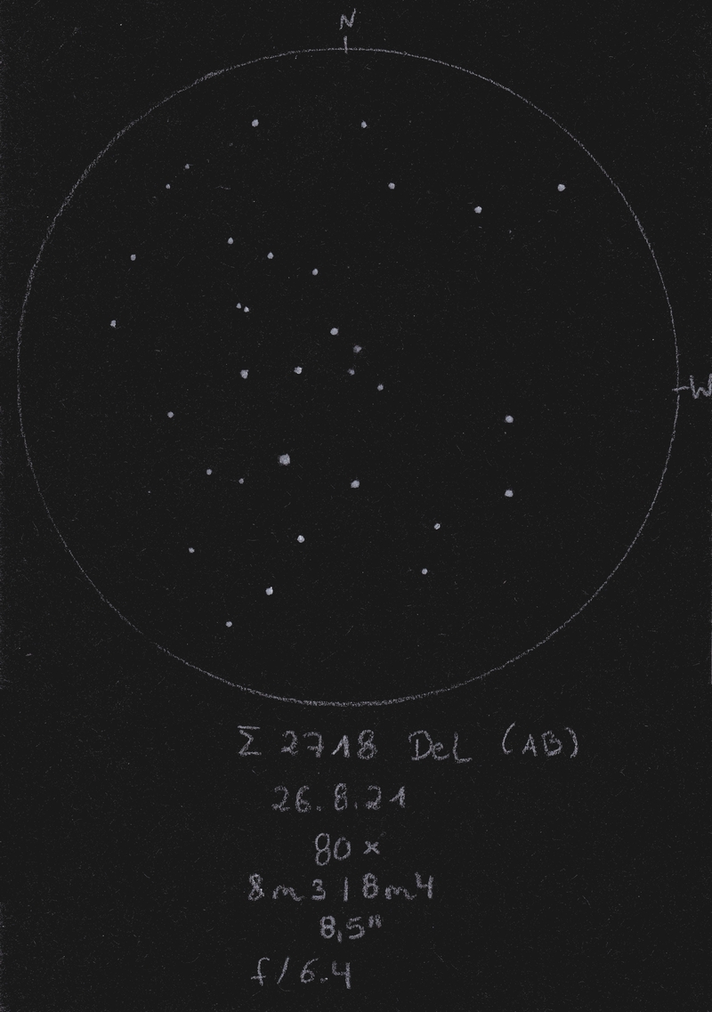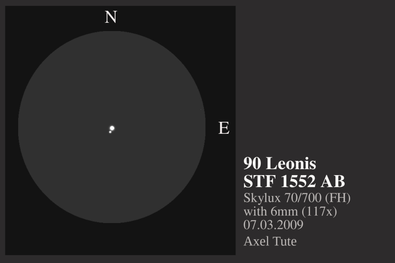 AB: Bei 57x nur knapp getrennt, wobei die B-Komponente als schwaches Sternchen erscheint. Bei 120x ist die B-Komponente deutlich und leicht elongiert auf dem ersten Beugungsring der Hauptkomponente zu sehen. Sehr schön. |