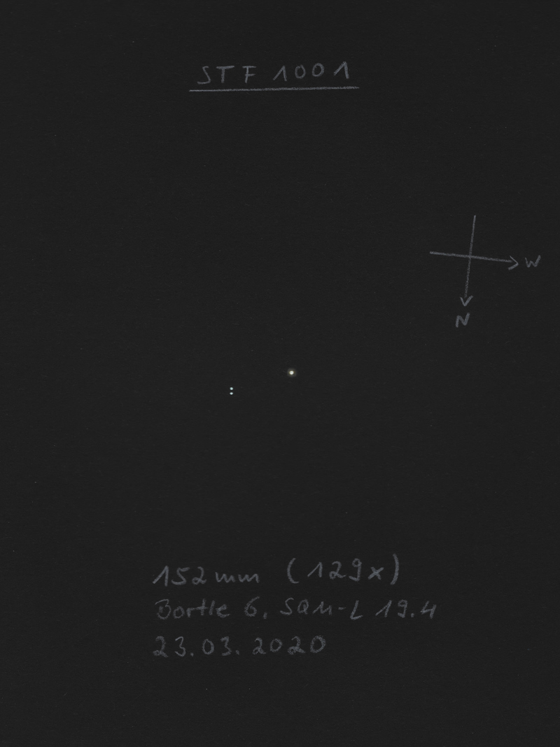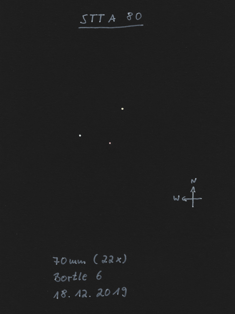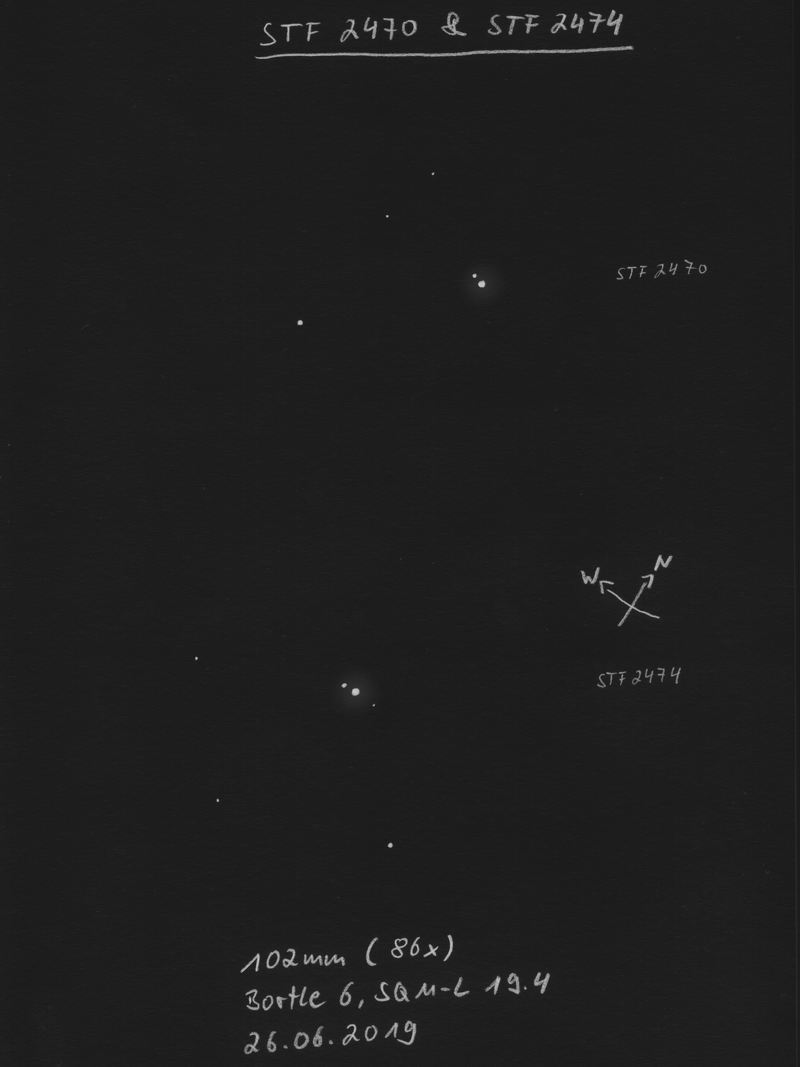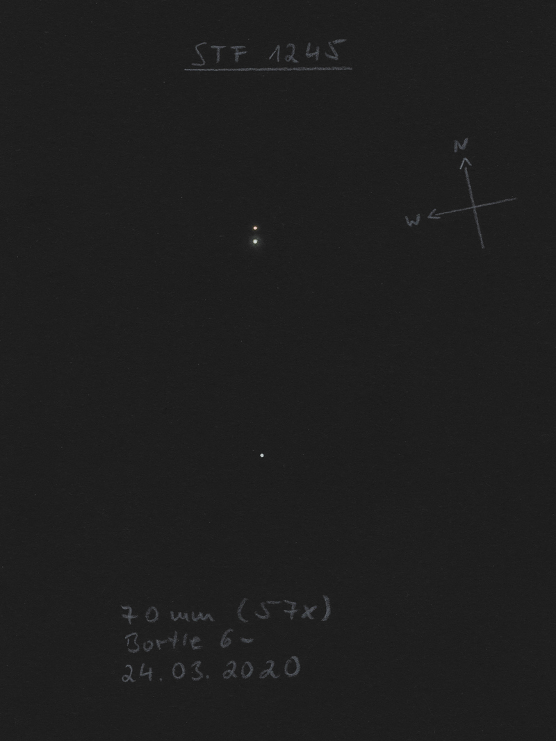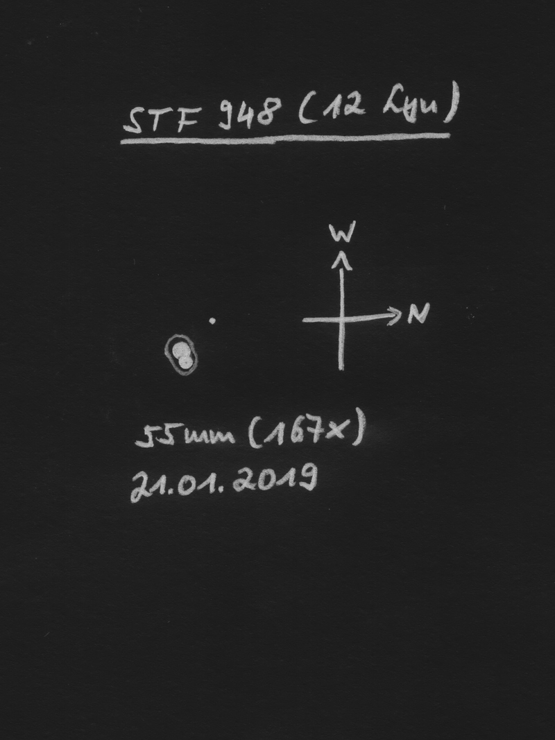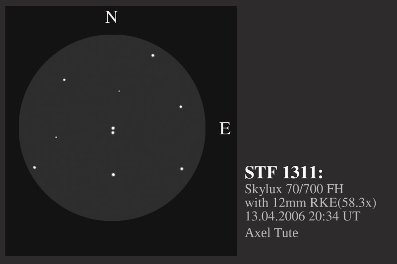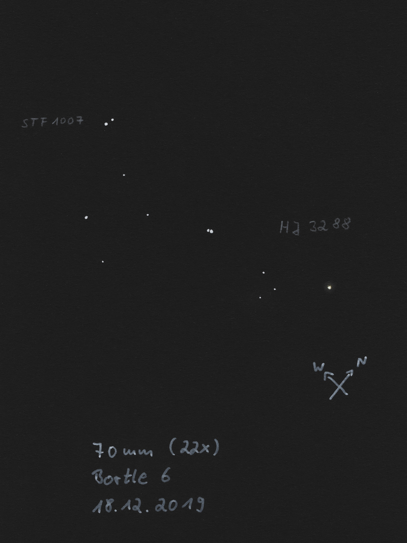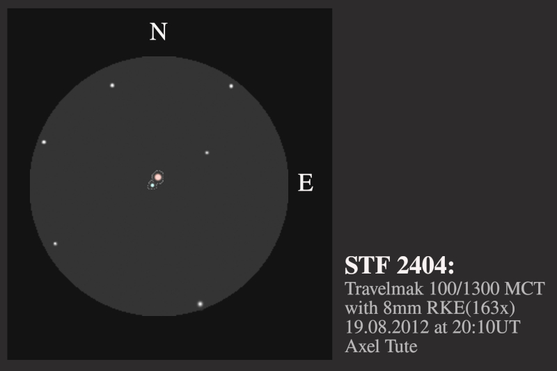 STF3012: Es war schwierig zu erkennen, welcher Stern der hellere war. Die Trennung war insgesamt nicht einfach. Anfangs sah ich nur einen länglichen Stern. STF3013: Anfangs sah ich nur einen länglichen Stern. Der große Helligkeitsunterschied macht die Trennung interessanterweise einfacher als STF3012. |