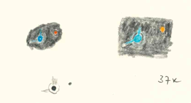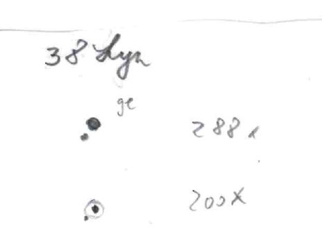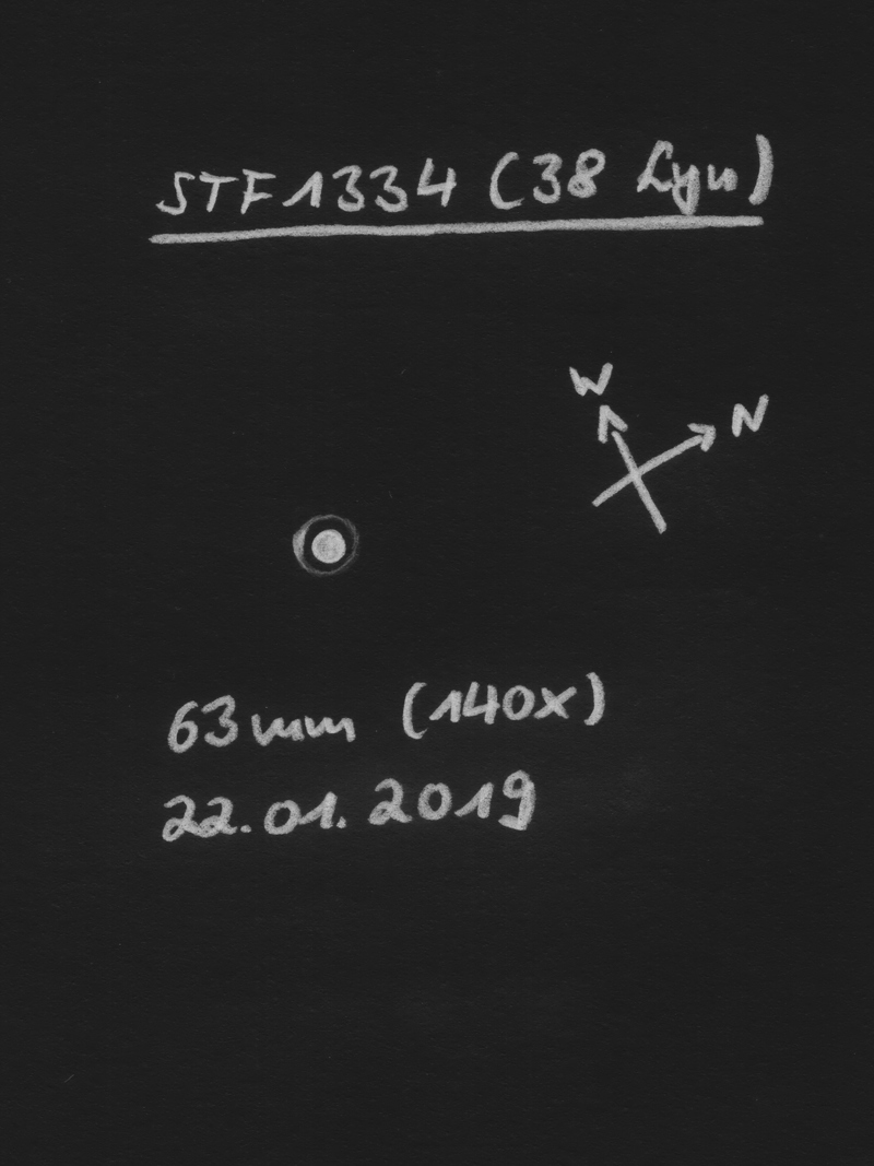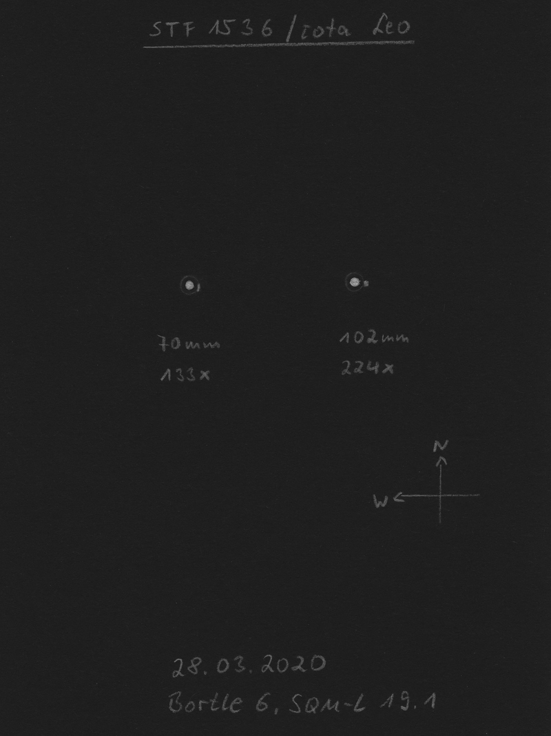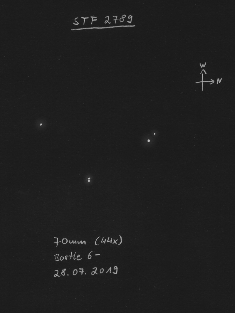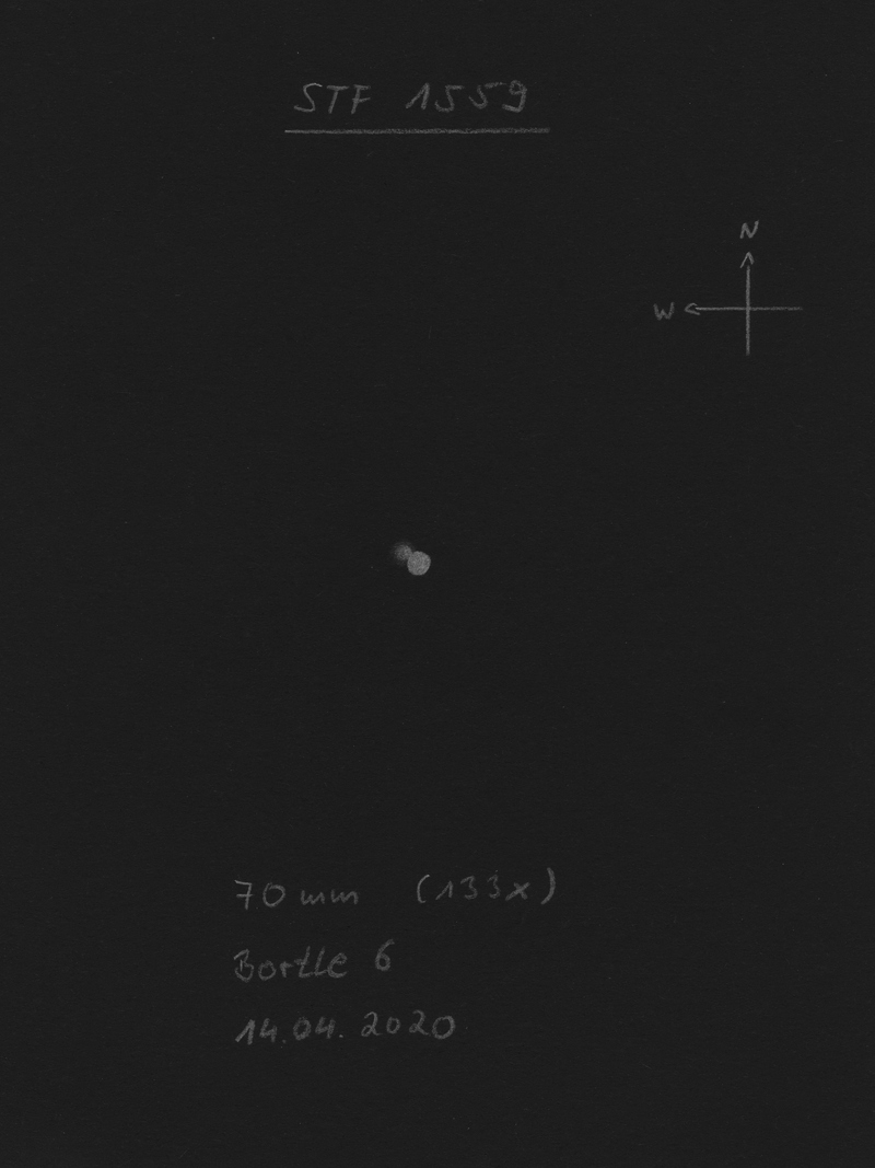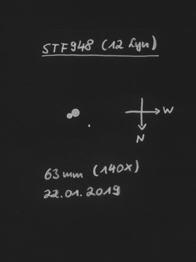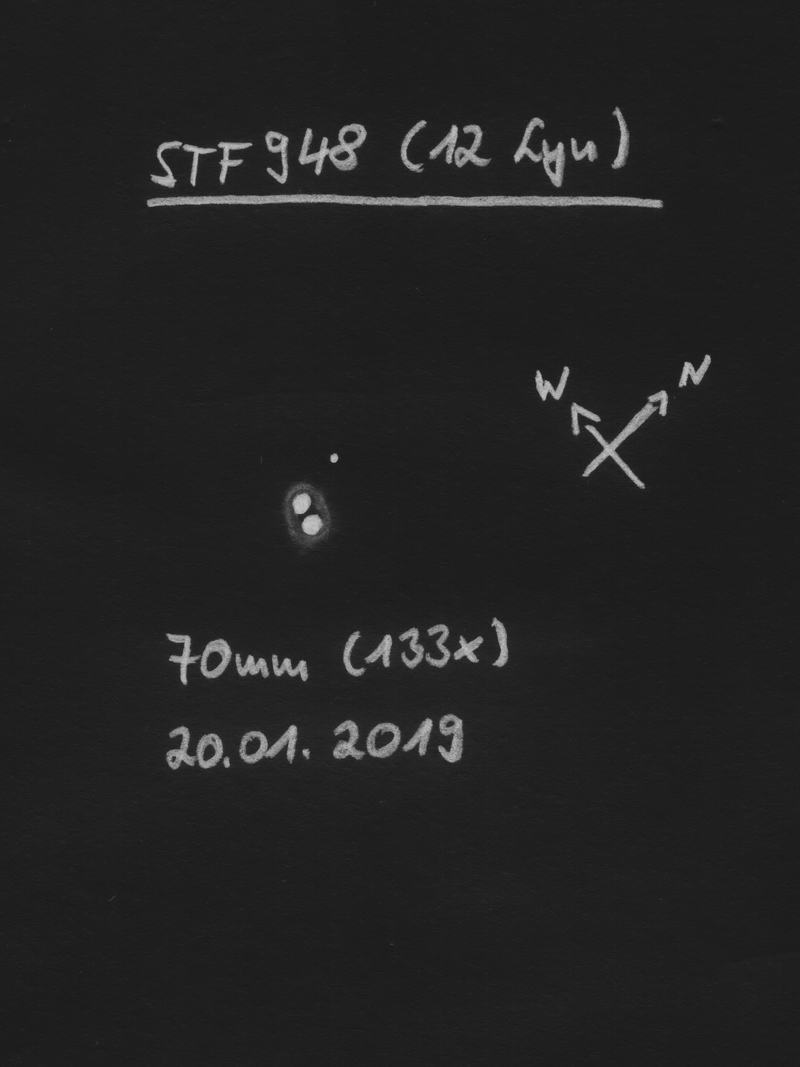 STF3012: Es war schwierig zu erkennen, welcher Stern der hellere war. Die Trennung war insgesamt nicht einfach. Anfangs sah ich nur einen länglichen Stern. STF3013: Anfangs sah ich nur einen länglichen Stern. Der große Helligkeitsunterschied macht die Trennung interessanterweise einfacher als STF3012. |