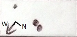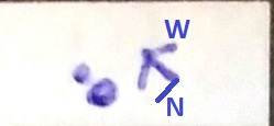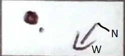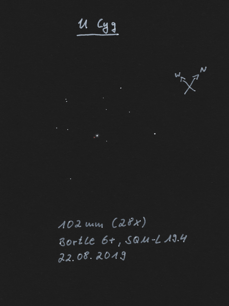 AB: Klar getrennt. A eindeutig heller als B. Unter fst 5m5 Himmel wirken beide Komponenten in diesem Mini-Fernglas schwach und es will kein Farbeindruck aufkommen. WZ Cas ist die Veränderlichen-Bezeichnung von Komponente A. Dieser halbregelmäßig veränderlicher Kohlenstoffstern hat eine mittlere Helligkeitsspanne von 6m8 bis 7m7, mit Extremwerten von 6m3 bis 8m8. Vielleicht war er gerade zu tief im Minimum, um mit 1 Zoll Öffnung Farbe zu zeigen? 15x45 Fernglas zeigte zeitgleich Farbe, siehe Beobachtung. |