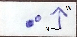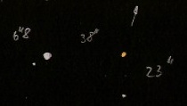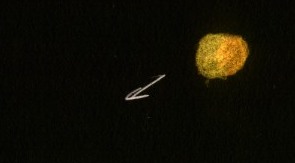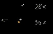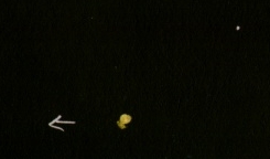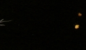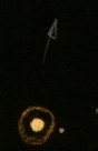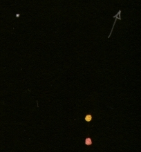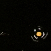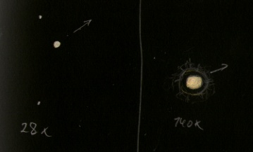 AB: bei 49-fach noch nicht getrennt, aber bereits als zwei schwach goldgelbe Murmelchen aneinander zu sehen - bei 80-fach auch noch nicht getrennt, nun dürfte es Luftunruhe sein - der Farbton bleibt warm goldgelb |