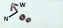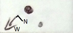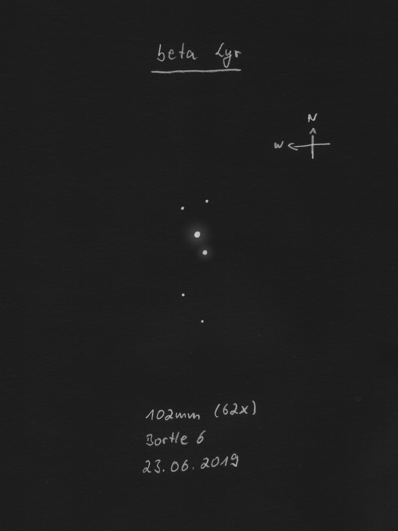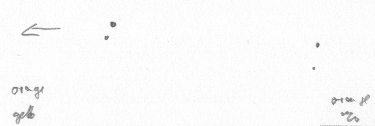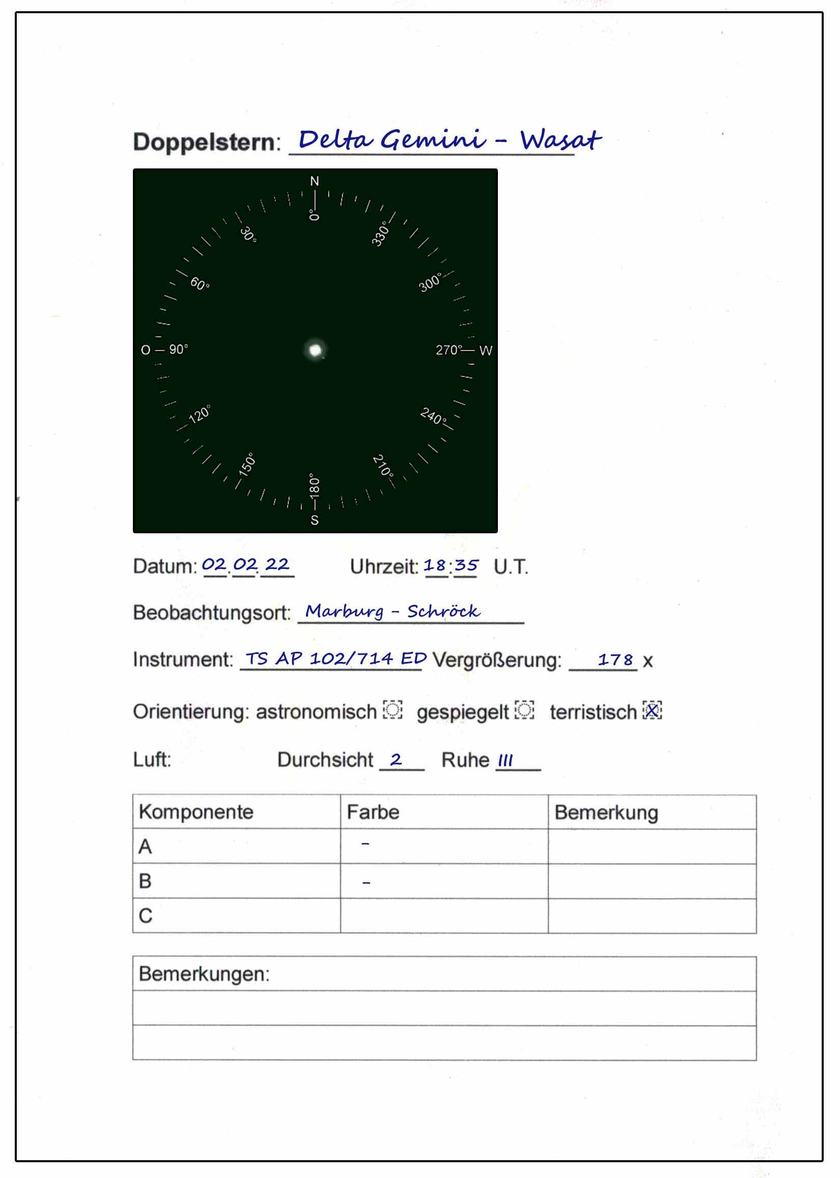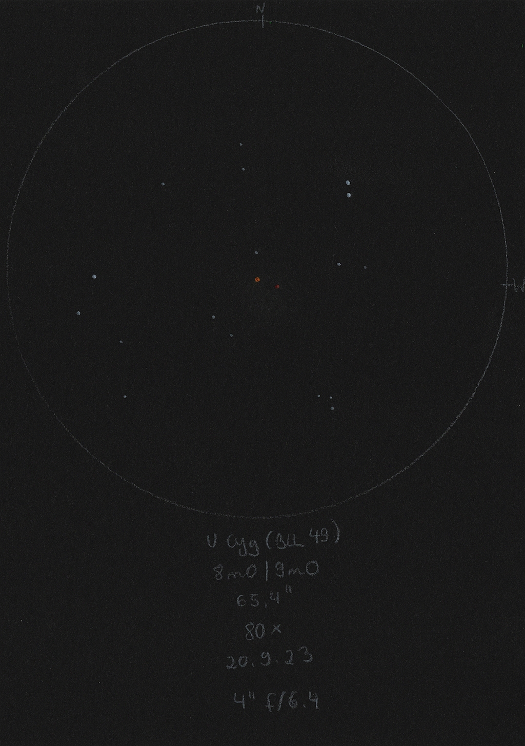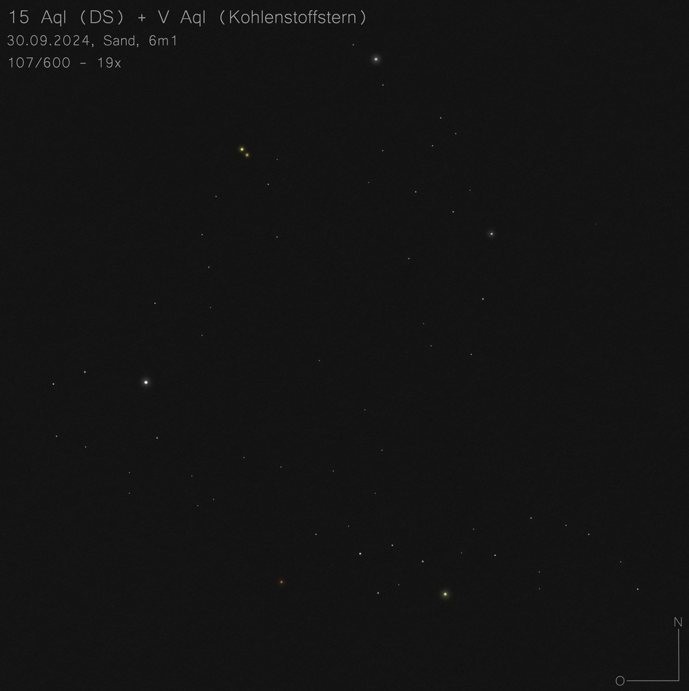 AB: Weit getrennt. A orange-rot, B kein bestimmter Farbeindruck. fst 5m5, zeitgleich mit obiger 6x24-Beobachtung. |