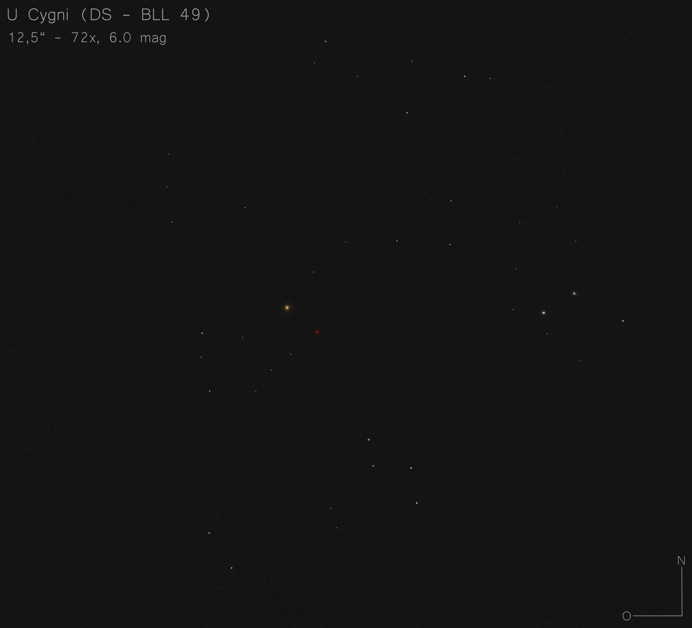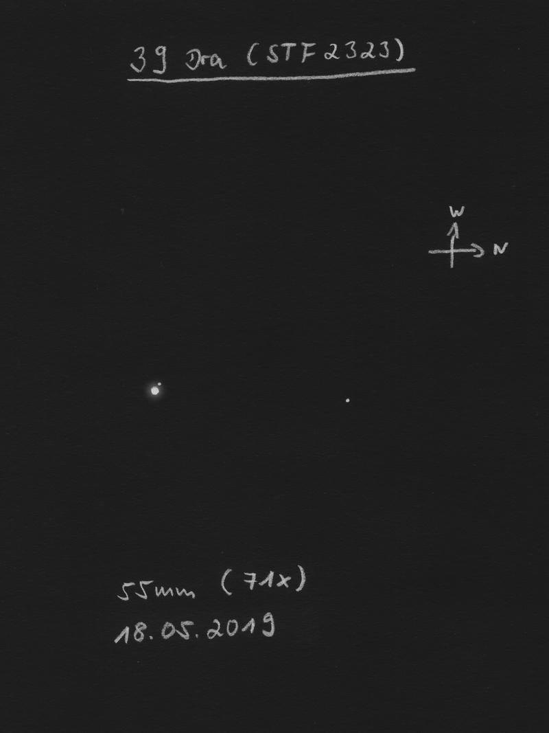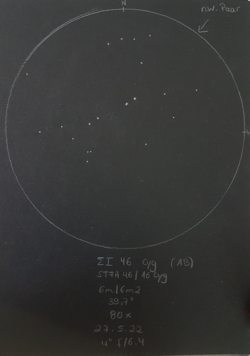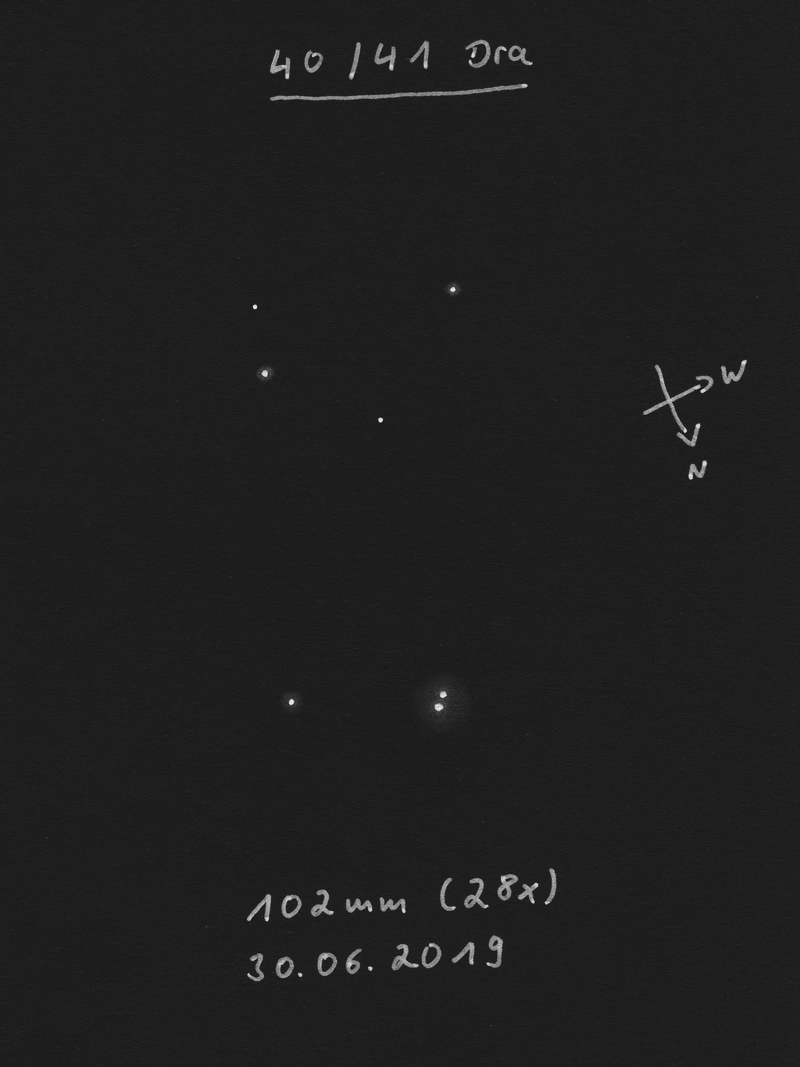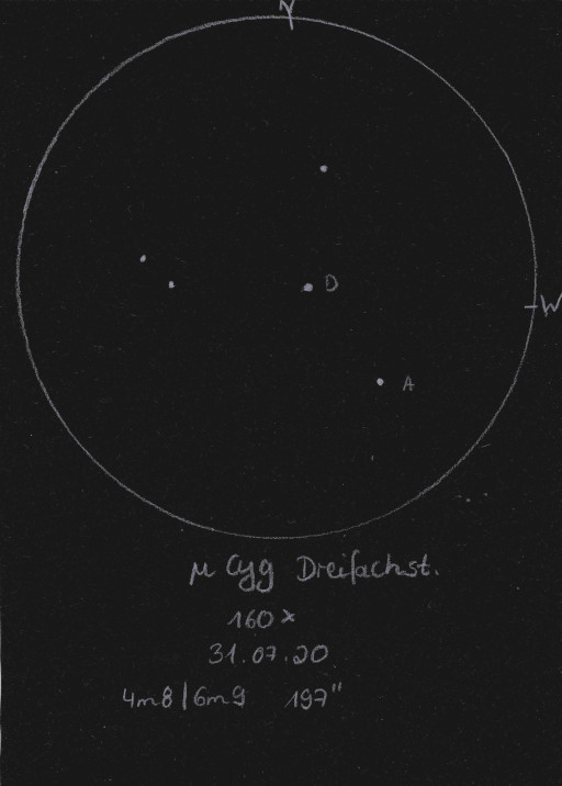 AB: bei 32x zeigt sich B ganz knapp getrennt nordwestlich von A - Helligkeitsunterschied gut 2 Größenklassen - der Doppelstern bildet mit drei helleren Sternen eine flache Drachenraute |