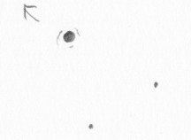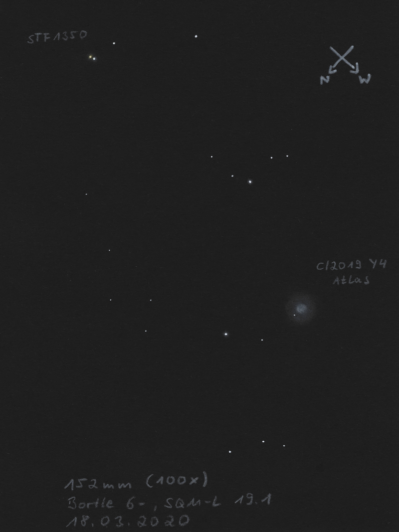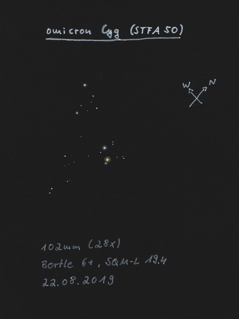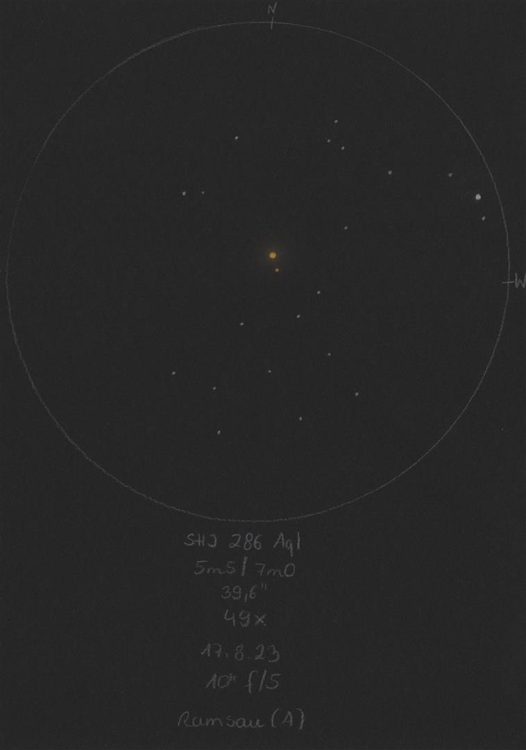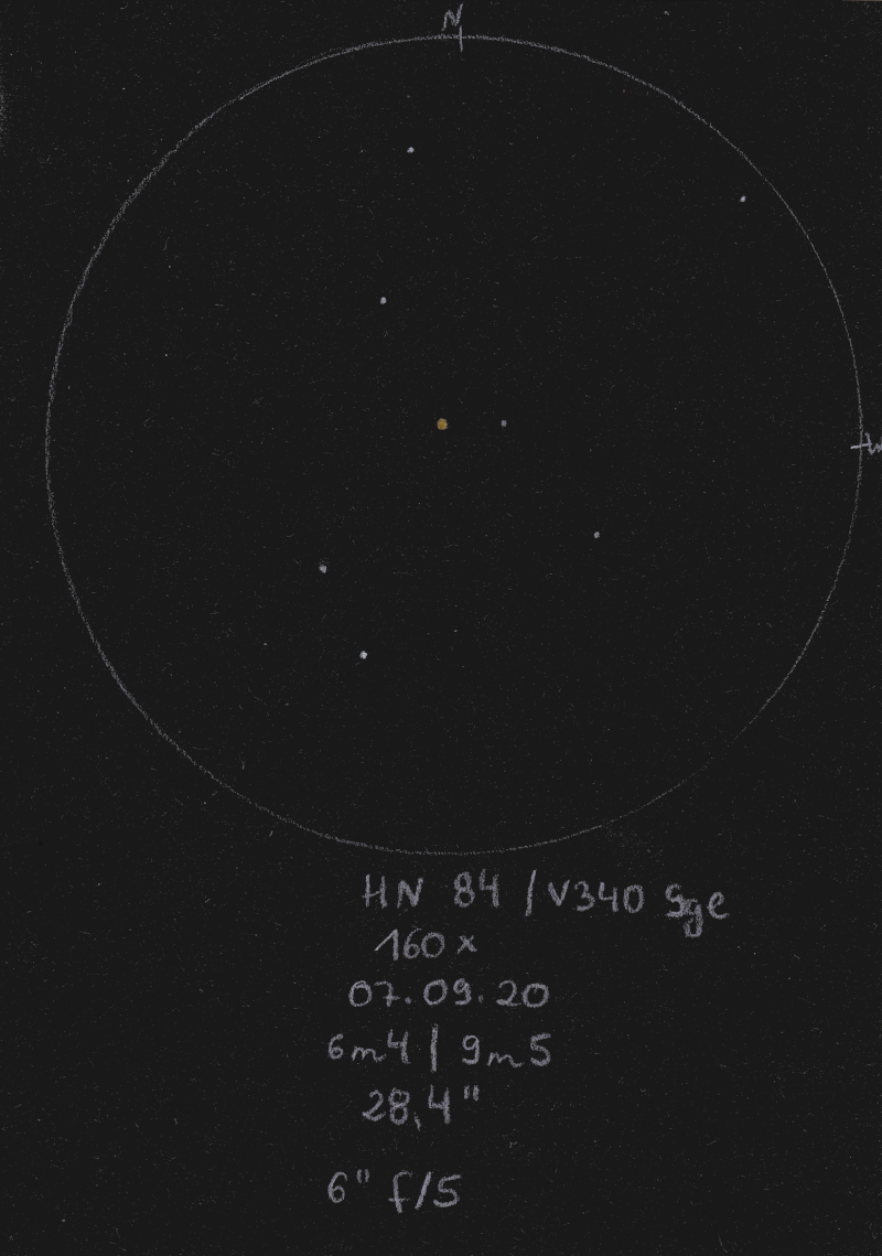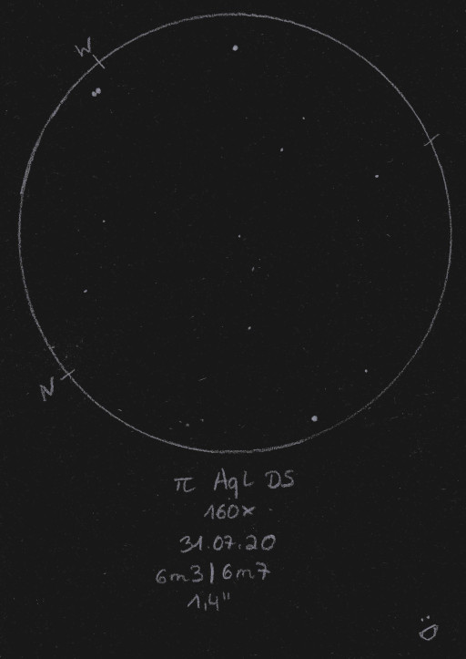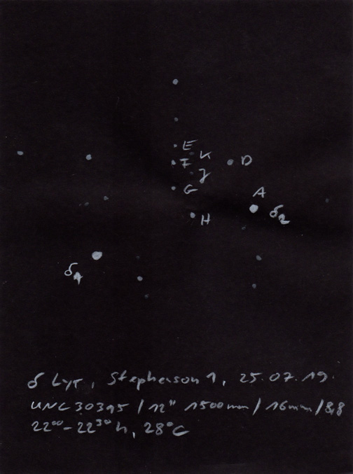 AB: bei 32x zeigt sich B ganz knapp getrennt nordwestlich von A - Helligkeitsunterschied gut 2 Größenklassen - der Doppelstern bildet mit drei helleren Sternen eine flache Drachenraute |