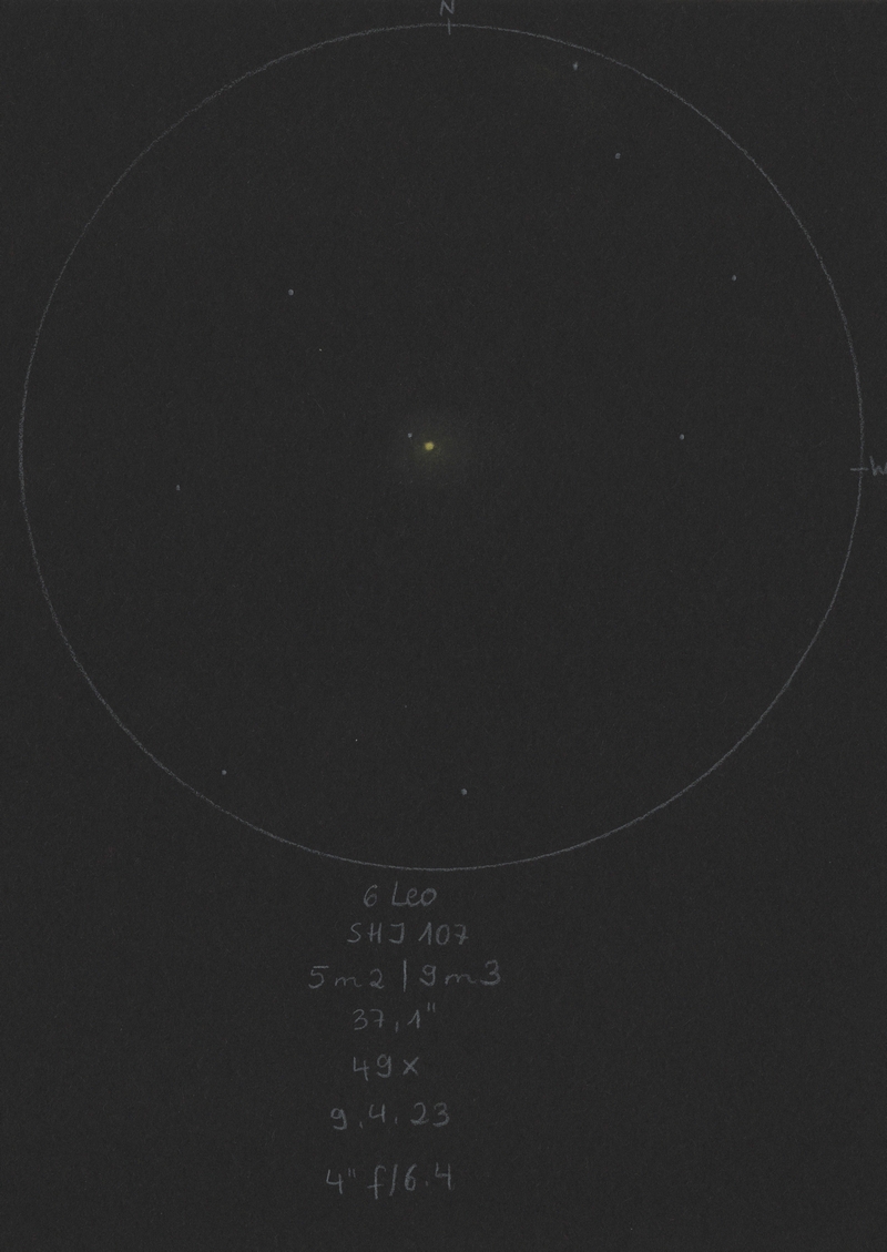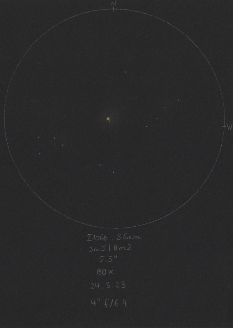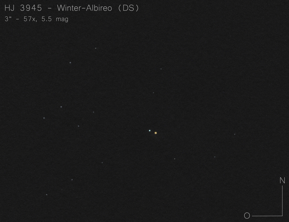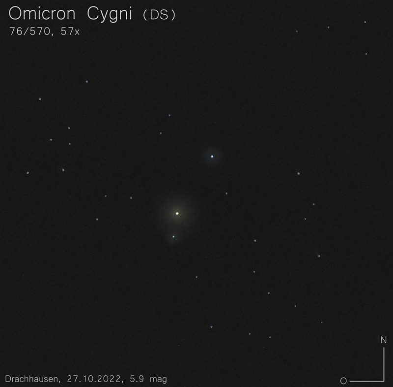 bei 29x ein wunderschönes, gut getrenntes Sternpaar - Komponente B im Nordosten schimmert kühlweiß, die A-Komponente zart weißgelblich, dadurch ein dezenter Farbkontrast - bei 57x wird der Farbkontrast deutlicher, B ist etwas mehr als eine Magnitude schwächer und wirkt nun blau-grau, Komponente A strahlt deutlich hellgelb |