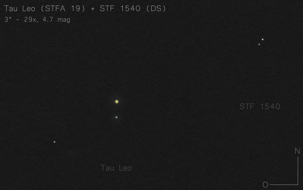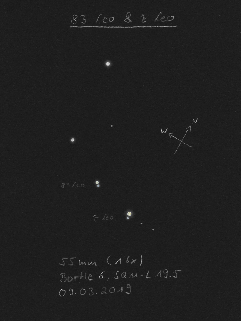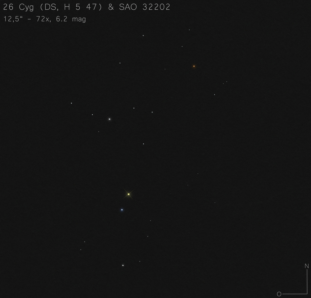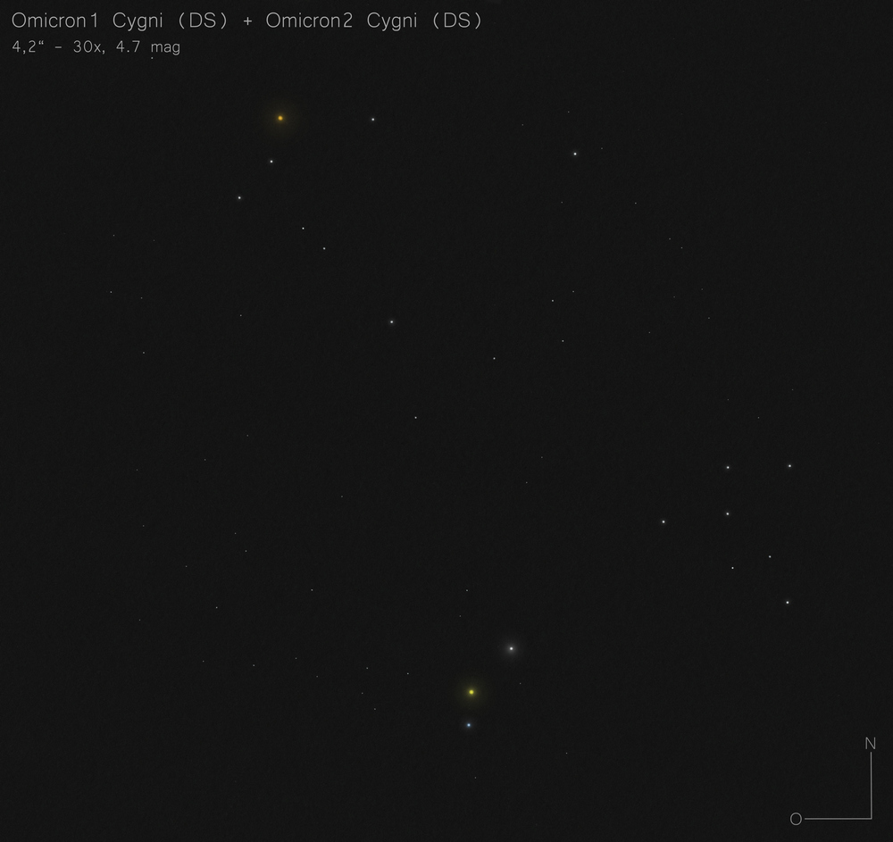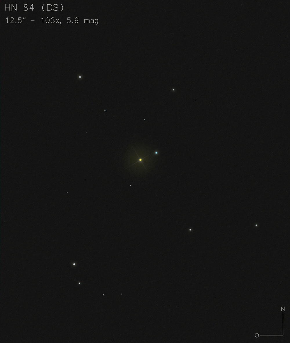 AB: einfach - beide Sterne zeigen sich komfortabel getrennt - Komponente A strahlt gelblich - Komponente B südöstlich wirkt dagegen grau und ist 1.5 bis 2 Größenklassen schwächer |