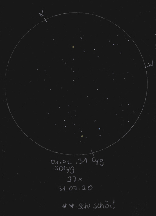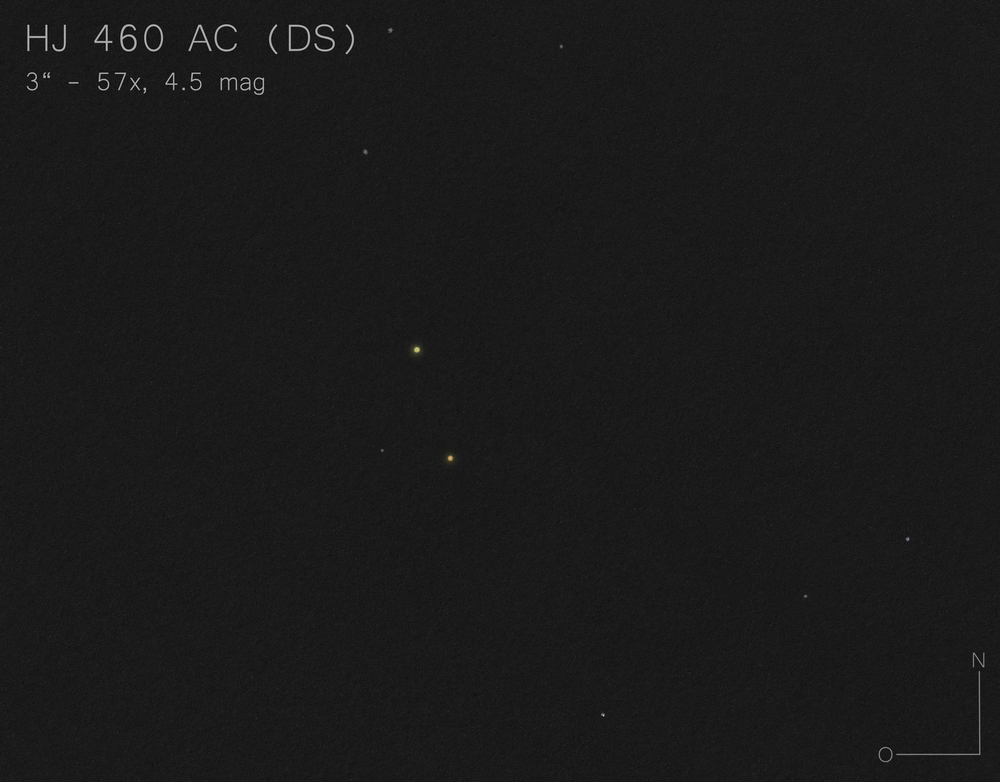 AB: bei 29x ein wunderschönes Sternpaar mit einem auffälligen Farbkontrast, weit getrennt - Komponente B wirkt weißgrau bis weißblau gegen die gelborange strahlende A-Komponente - Helligkeitsunterschied eine Größenklasse |