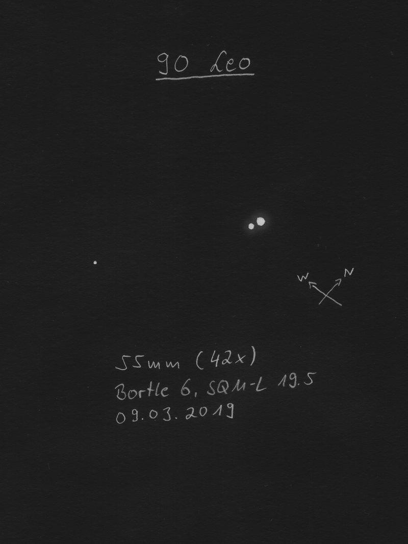 bei 20x knapp getrennt, Komponente B östlich ist halb so hell wie A - während Komponente A weiß-gelblich strahlt, zeigt B sich weiß mit einem leichten Stich ins bläuliche |