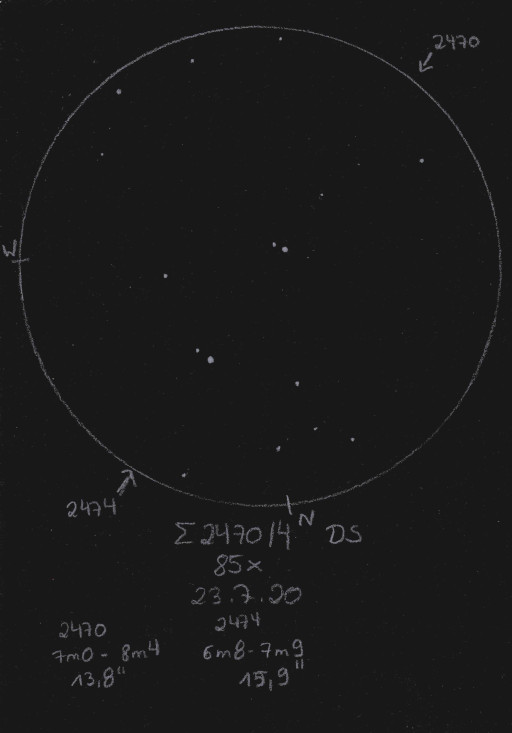 26.10.2006: Schönes Sternpaar in einem interessanten Sternfeld. Einfach zu trennen im C8 mit dem 26mm Plössl Okular. A ist leicht orange, B ist leicht grünlich. Ebenfalls sehr schön im Comet Catcher (140/500mm Schmidt-Newton) bei 50x im 10mm Plössl. |