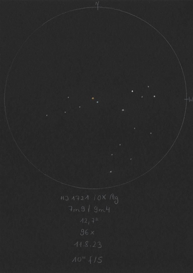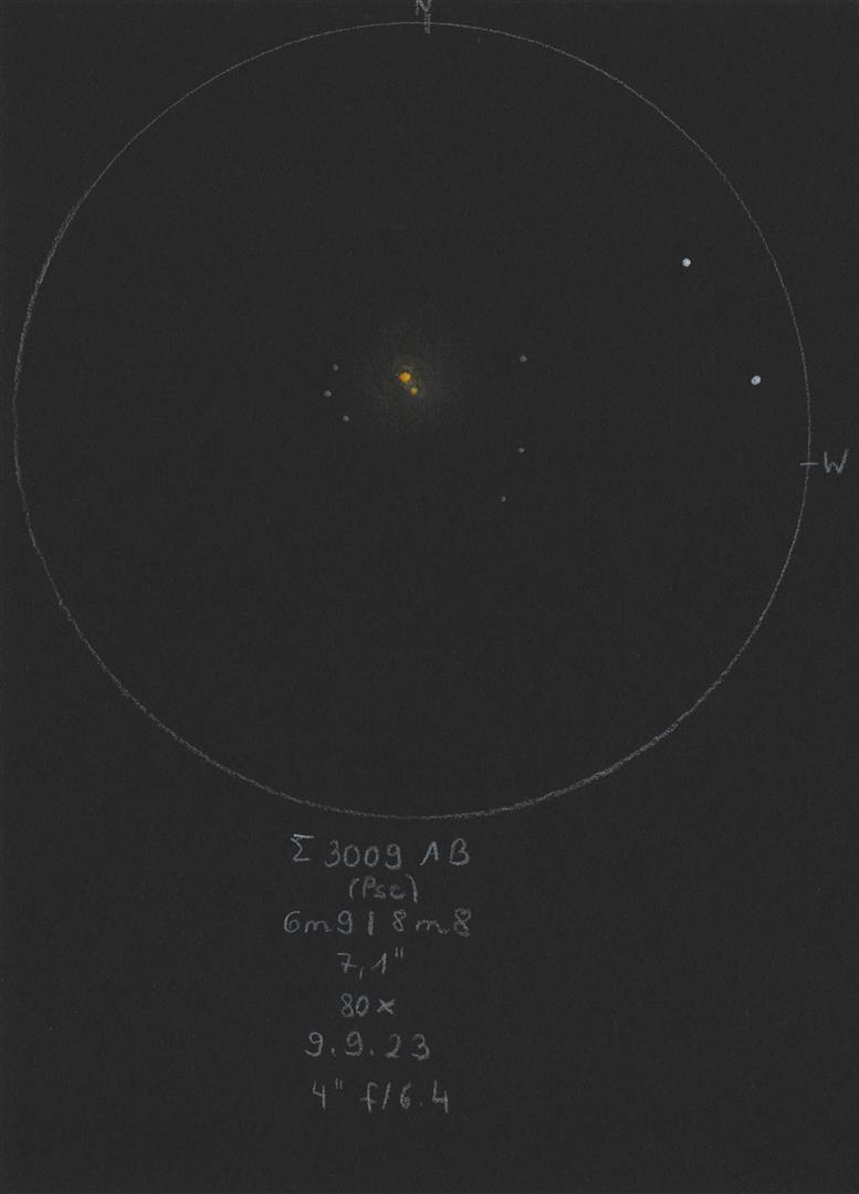 A-BC: 02.10.23: bei 21-fach als nordwestlichster der drei "Psi-Aquarii-Sterne" und gleich warmgold zu sehen - bei 49-fach taucht nordwestlich von der vor allem im Gegensatz zu Psi 2 und Psi 3 schön goldgelben A-Komponente mit weißem Farbtupfer mittig weit abgesetzt der ganz schwache, dunkelgraue Begleiter auf |