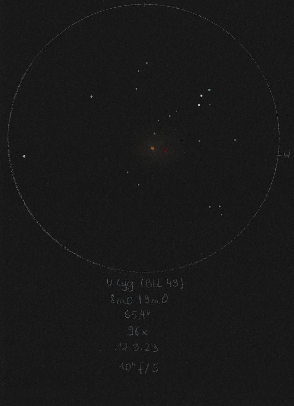 AB: sticht sofort ins Auge aufgrund des stärksten kupferroten Farbtons, den ich seit langem gesehen habe - der Begleiter strahlt bei 49-fach schon weit abgesetzt in einem graublauen, ganz kühlen Farbton |