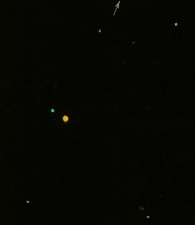schon in Aufsuchvergrößerung ganz leicht gelblich zu sehen und ist hauchfein getrennt - bei 49-fach dann nah, aber deutlich getrennt - die Hauptkomponente strahlt richtig schön goldgelb, der Begleiter zeigt ein schmutziges Gelb |