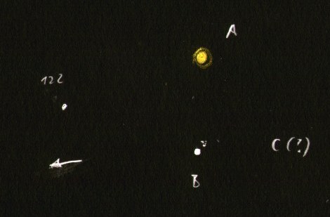 A-BC: bei 20x riecht das nicht nach Trennung, sondern es sieht nach weit auseinander stehenden Sternen aus - Komponente BC ist kupferbraun und genauso hell wie die weiß strahlende Komponente A - auf die Trennung von BC habe ich leider nicht geachtet (Sep. 3,3" laut Stelle Doppie) |