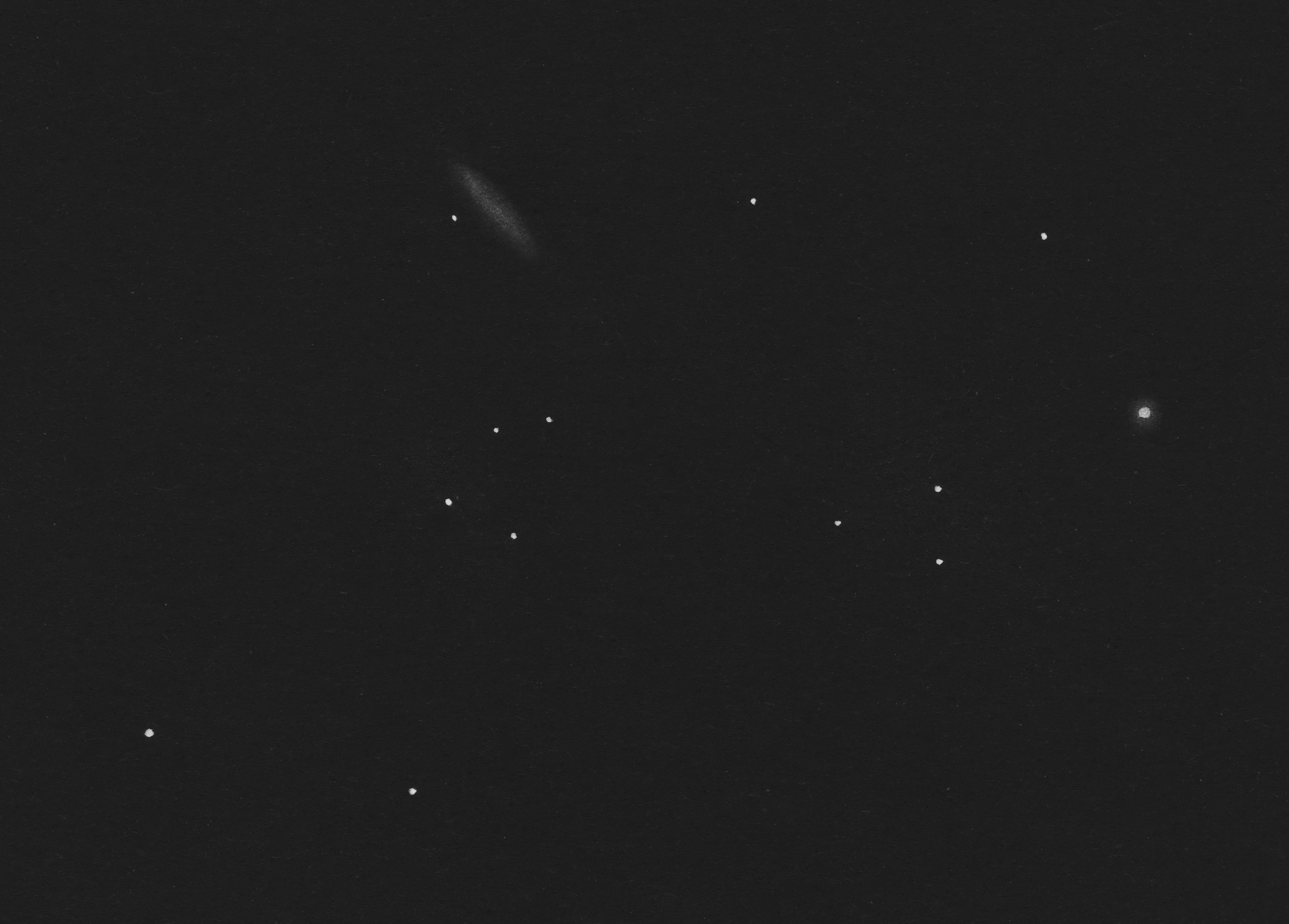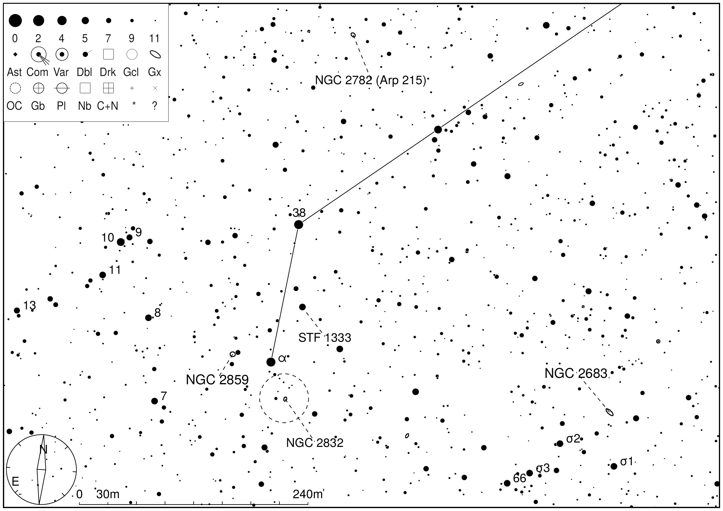 Weiter westlich liegt die Galaxie NGC 2683, welche sich nahezu in Kantenlage präsentiert und mit einer scheinbaren Gesamthelligkeit von etwa 9m.7 hell genug ist, um auch in kleineren Teleskopen unter Vorstadtbedingungen gut beobachtet werden zu können. Durch ihr Aussehen wird sie auch UFO-Galaxie genannt. NGC 2683 ist eine Spiralgalaxie vom Hubble-Typ Sb mit aktivem Galaxienkern. Unter eher städtischen Bedingungen (Bortle 6) lässt sie sich gut mit 100mm Teleskopöffnung beobachten und zeigt sich länglich, aber ohne nennenswerte Helligkeitszunahme Richtung Zentrum. Unter dunklem Landhimmel (Bortle 3) ist sie auch mit einem 18x70 Fernglas gut erreichbar und erscheint als homogener, schmaler Nebel. Die Galaxie ist in einem schönen Sternumfeld eingebettet und lohnt sich ebenfalls für Fotografen.