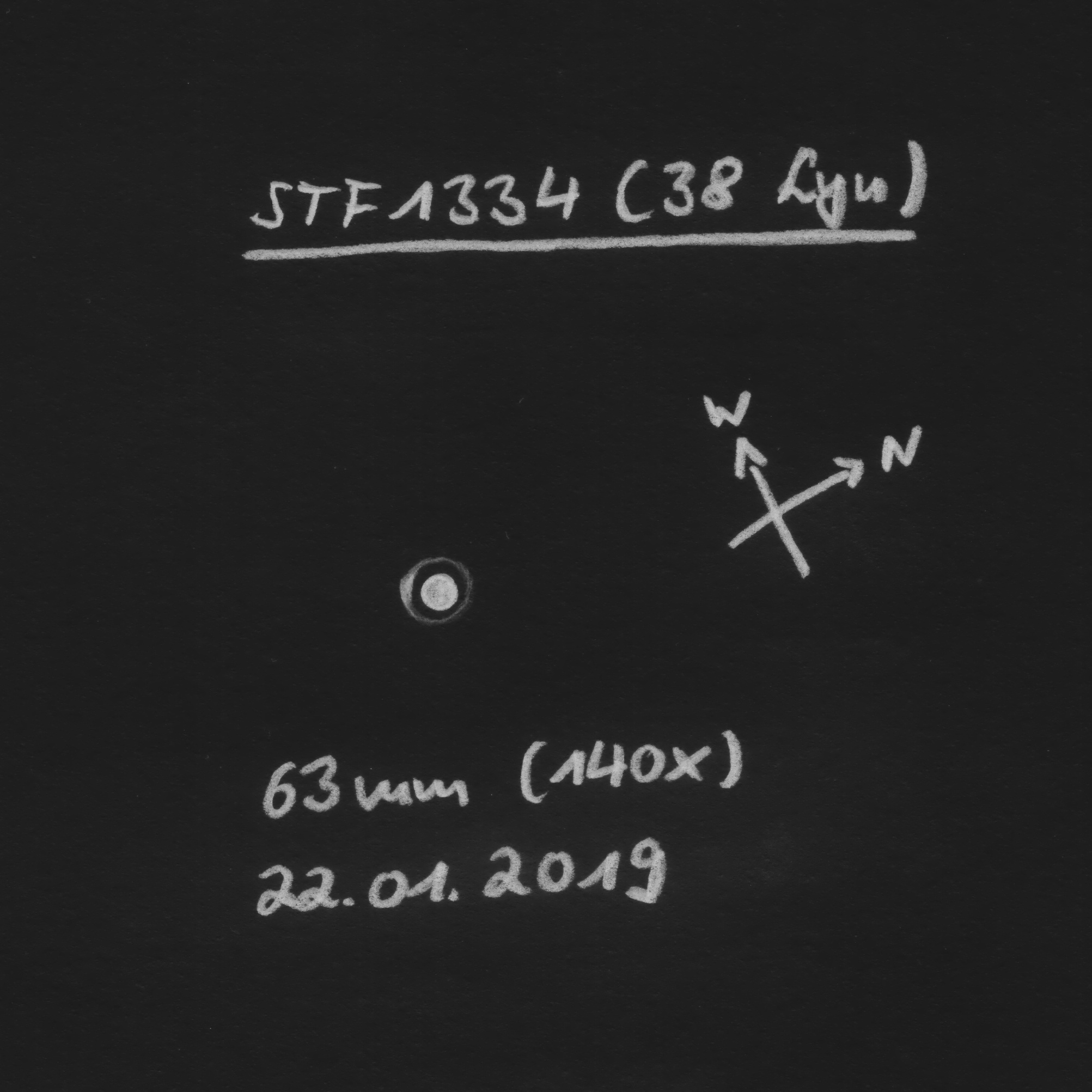 Zwischen alpha und 38 Lyncis findet sich noch der Doppelstern STF 1333. Der Winkelabstand ist mit 1.9" zwar geringer, aber die Komponenten sind mit 6m.6 & 6m.7 nahezu gleich hell, sodass eine Trennung mit 60mm Teleskopöffnung bei hoher Vergrößerung möglich ist. Auch hier werden die Komponenten weiß oder gelblich wahrgenommen.