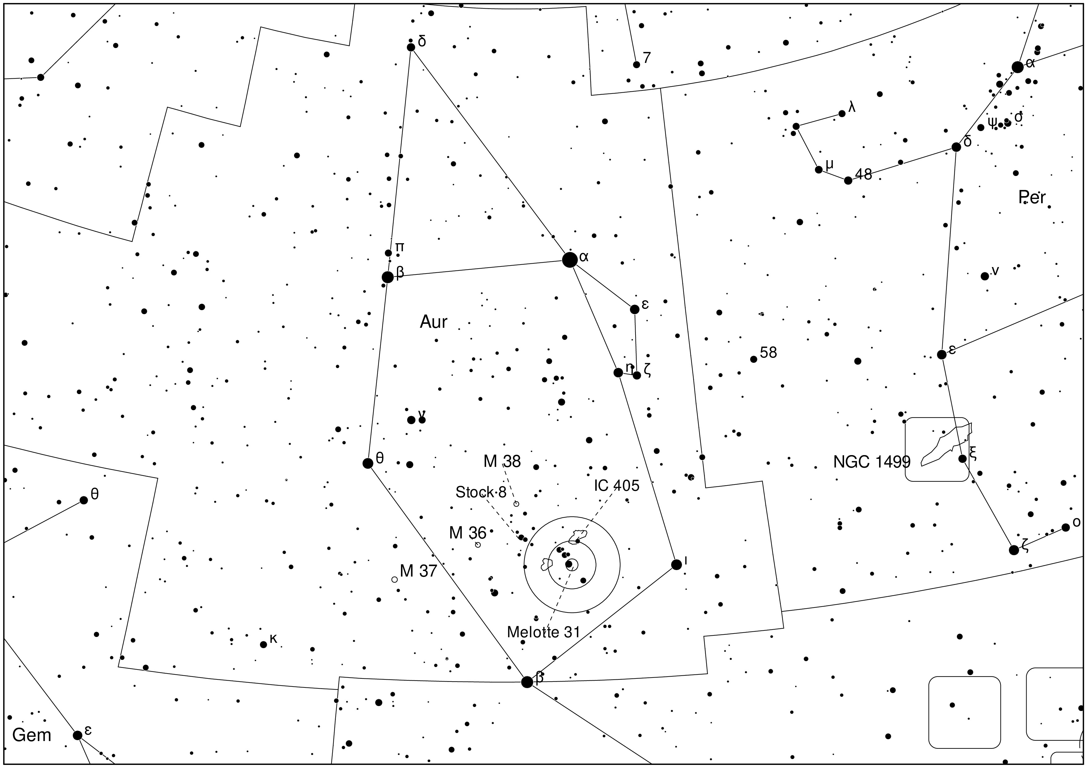 In diesem Winter wollen wir den Fuhrmann auf seinem Weg begleiten. Bereits mit freiem Auge zeigt sich das Sternbild sehr auffällig. Mit dem Fernglas bieten vor allem die prominenten Sternhaufen einen fantastischen Anblick, welche visuell sehr unterschiedlich wirken. Messier 36 kommt mehr als kompakte, helle Sterngruppe daher, während Messier 37 größer und viel sternreicher erscheint. Deutlich schwächer und unregelmäßig zeigt sich dagegen Messier 38. Im schwach vergrößernden Fernglas können sogar alle drei Sternhaufen zusammen beobachtet werden, was ein lohnender Anblick ist. Abhängig von der Vergrößerung lassen sich die Sternhaufen mit dem Fernglas in Einzelsterne auflösen. Der geübte Beobachter wird sicher auch den offenen Sternhaufen NGC 1907 nahe Messier 38 erfassen können, auch wenn dieser nur als kleine, matte Aufhellung zu sehen ist.