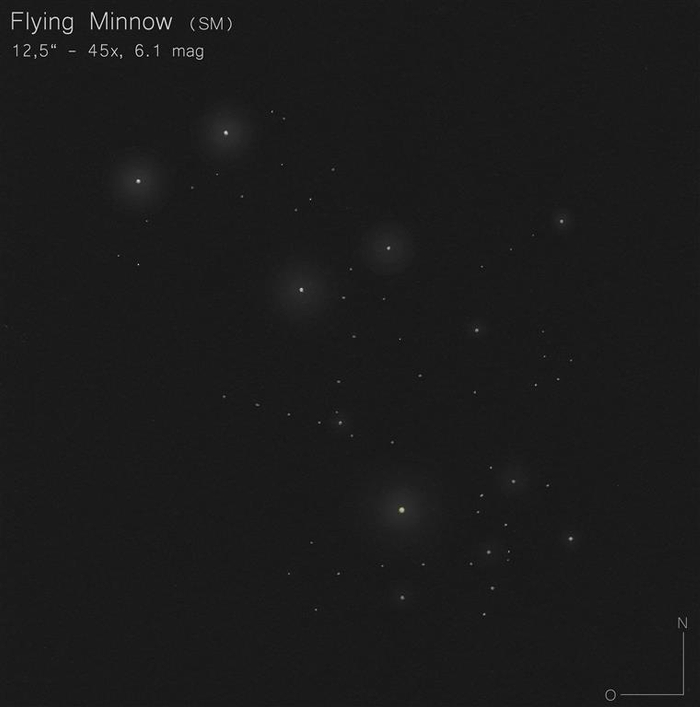 Inmitten des Sternbildes ist mit dem freien Auge eine längliche Aufhellung auffällig. Es handelt sich um den Sternhaufen Melotte 31, welcher sich über 2 Grad am Himmel erstreckt und damit ebenfalls ein schönes Ziel für das Fernglas ist. Der Sternhaufen zeigt etliche Sterne sehr unterschiedlicher Helligkeit ohne erkennbare Konzentration, welche locker verteilt und länglich angeordnet sind. Im Nordosten des Sternhaufens dominiert eine Sterngruppe, zu welcher die Sterne 16 bis 18 Aurigae gehören. Diese wird oft auch „Flying Minnow” (dt. fliegende Elritze; eine kleine Fischart) genannt. Mit größerem Instrument treten dann auch immer mehr schwächere Sterne hervor, wie die Zeichnung von René Merting sehr schön zeigt.